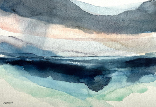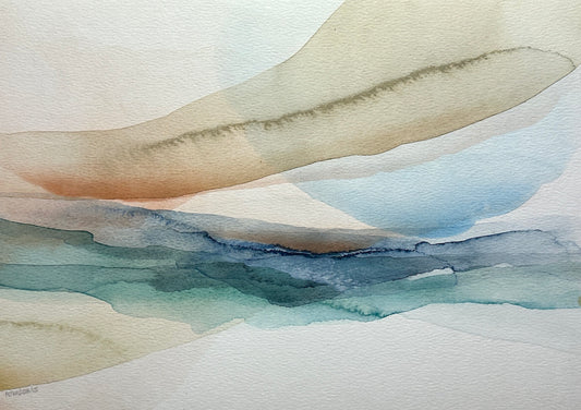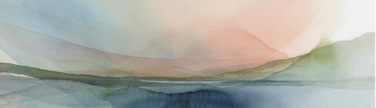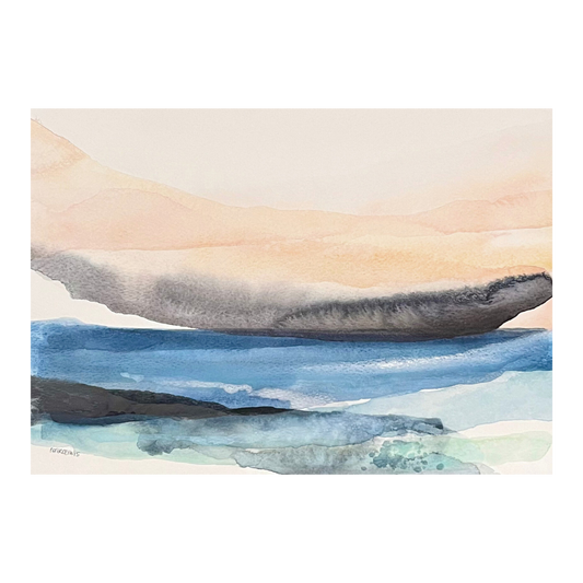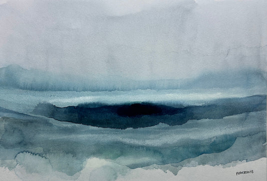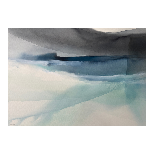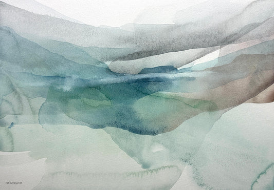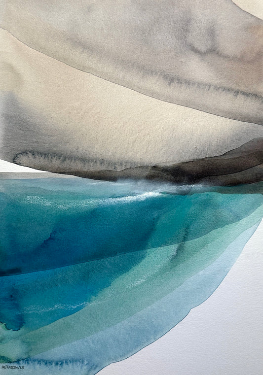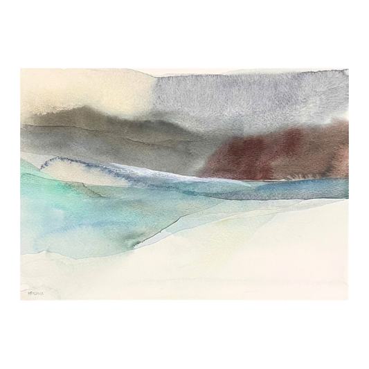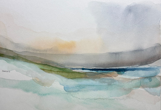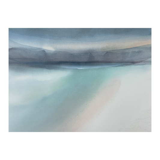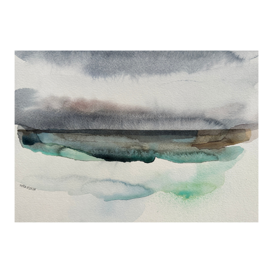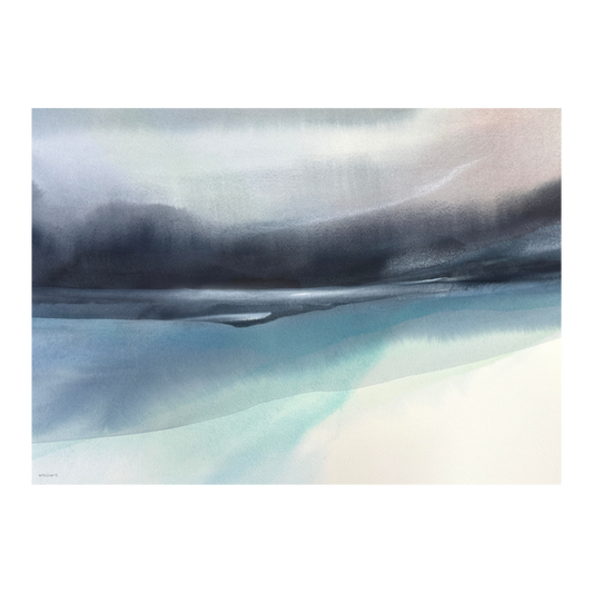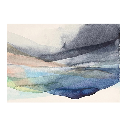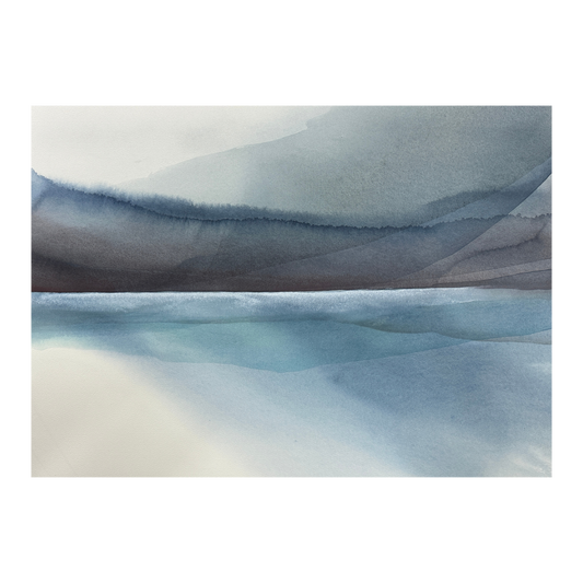 Painting Northern landscapes for over 40 years, it is Peter’s experimental handling of watercolour which is pivotal to these ethereal conjurings of the Shetland landscape. Instead of traditional brushwork you will see expansive washes of colour, areas of pooling and feather-like, bleeding marks. Peter leans into the natural fluidity of watercolour and its obedience to gravity - expertly directing the water but also allowing it to flow unpredictably.