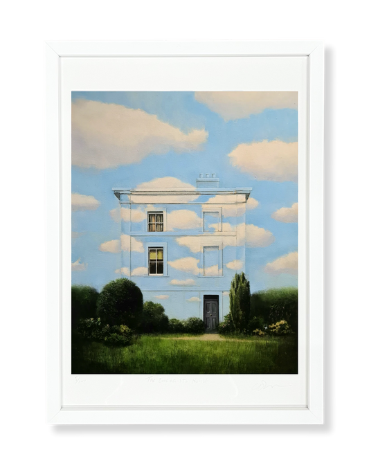 This series marks a new chapter in his practice. Just as the black and white cat traces Chris’s steps, the spirit of Surrealism has quietly followed his paintbrush for many years. We see his interest in the uncanny and the overlooked progress to a new level of visual playfulness, René Magritte’s influence louder than ever. Chris wanders further into the mysterious, unexpected and unconventional. We perhaps feel a little like Christopher Reeve’s time-traveller in the 1980 film Somewhere in Time. Disorientated, but captivated by exquisite beauty.