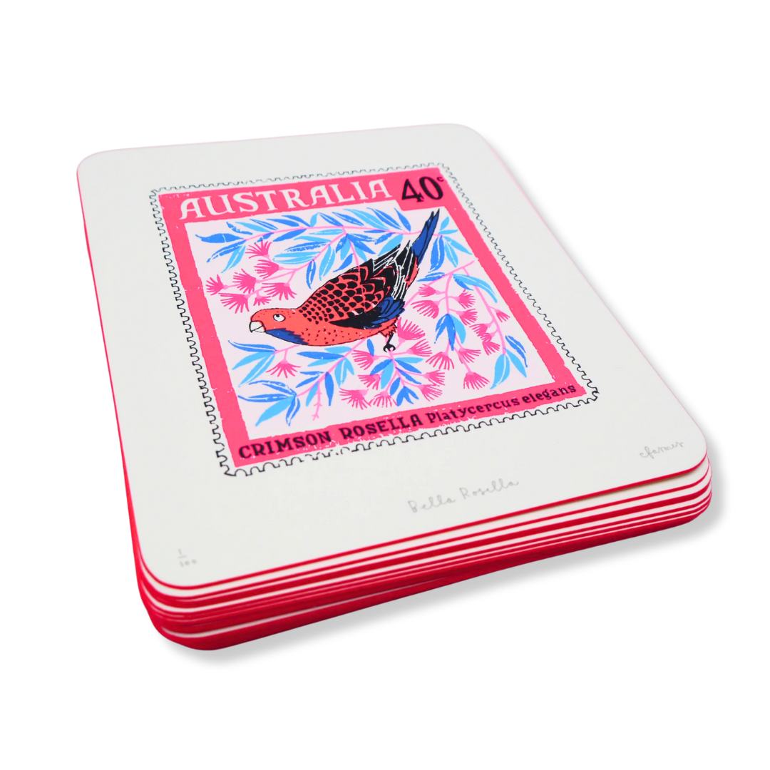 Signed and numbered limited edition of 100 screen print with neon pink edges and rounded corners on 750 gsm card.