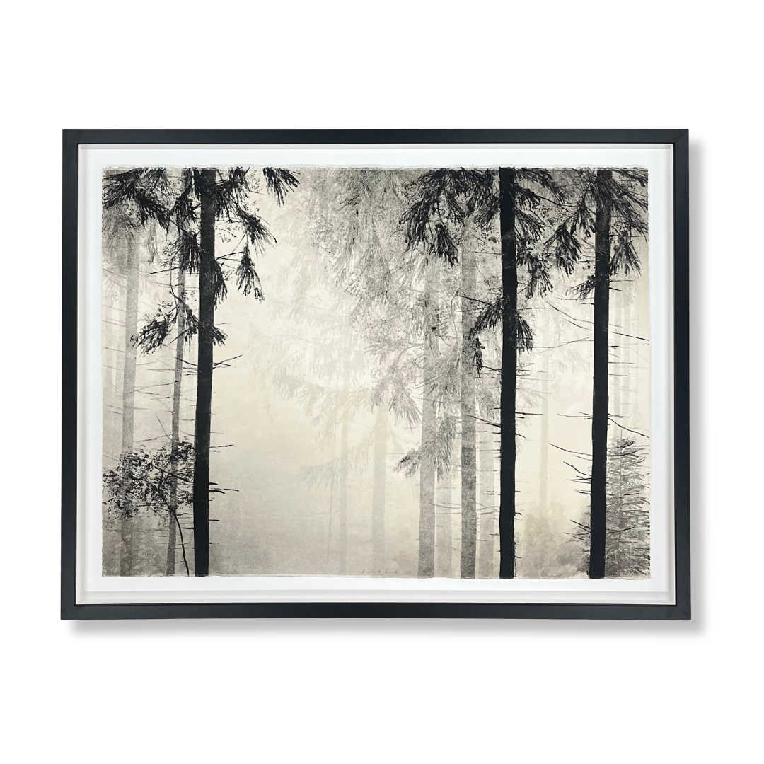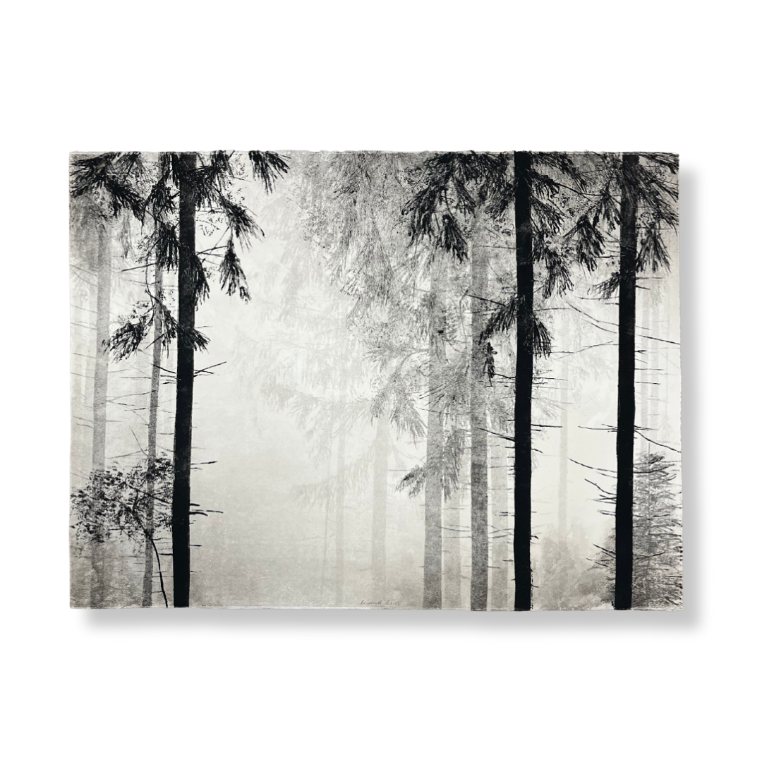 Through Fiona’s deeply atmospheric and evocative original monotypes, we step into the forest. Into the unknown, the wild and a space laden with metaphysical meaning and narrative. An important symbol for Fiona, the forest is both a mysterious, haunting place full of uncertainty and fragility, and a healing, restorative space for the planet and the individual.