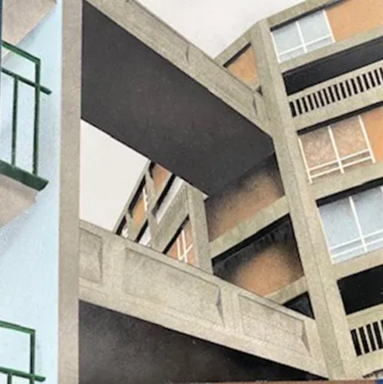 Mandy’s immaculately painted artworks pay close attention to the urban landscape, focusing on Brutalist architecture to explore issues like gentrification and social class. She refuses to overlook the mundane and instead enjoys documenting housing estates in transition - parts of which are continually lost alongside the displacement of their inhabitants.