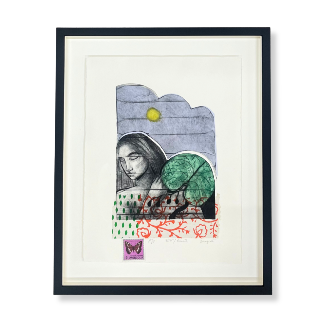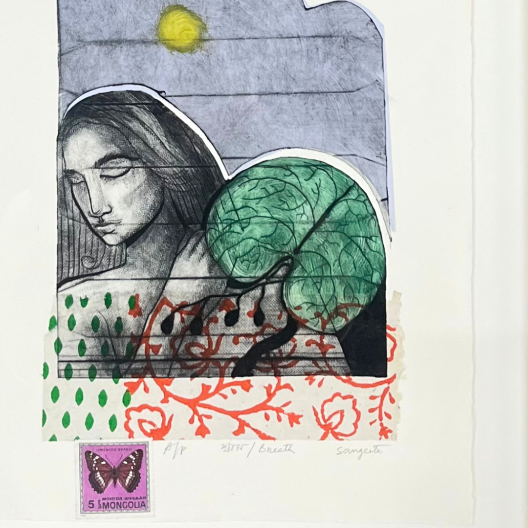 Sangeeta Bhagawati is an Indian printmaker now calling London home. She specializes in relief and intaglio printing, weaving her life drawing practice into her printmaking. Central to her work are the mark makings and carvings on the body, which serve as a canvas for exploring themes of pleasure, loss, power, and growth. Her relief and intaglio prints depict bodies in both connection and solitude, inviting viewers to engage with diverse interpretations. Through her carvings and expressive marks, Sangeeta aims to evoke a rich spectrum of emotions, making the human form a focal point of her artistic expression.