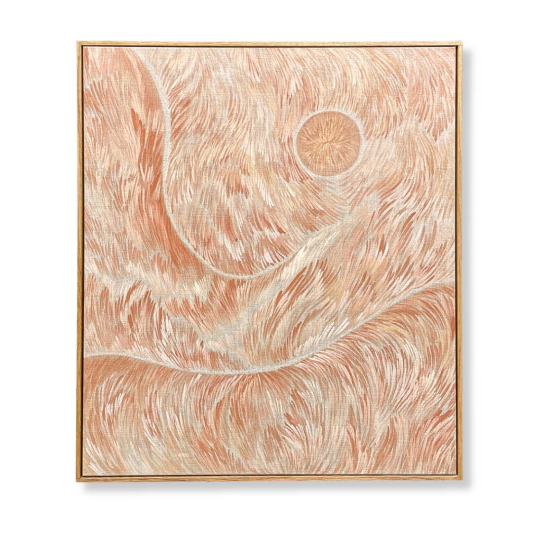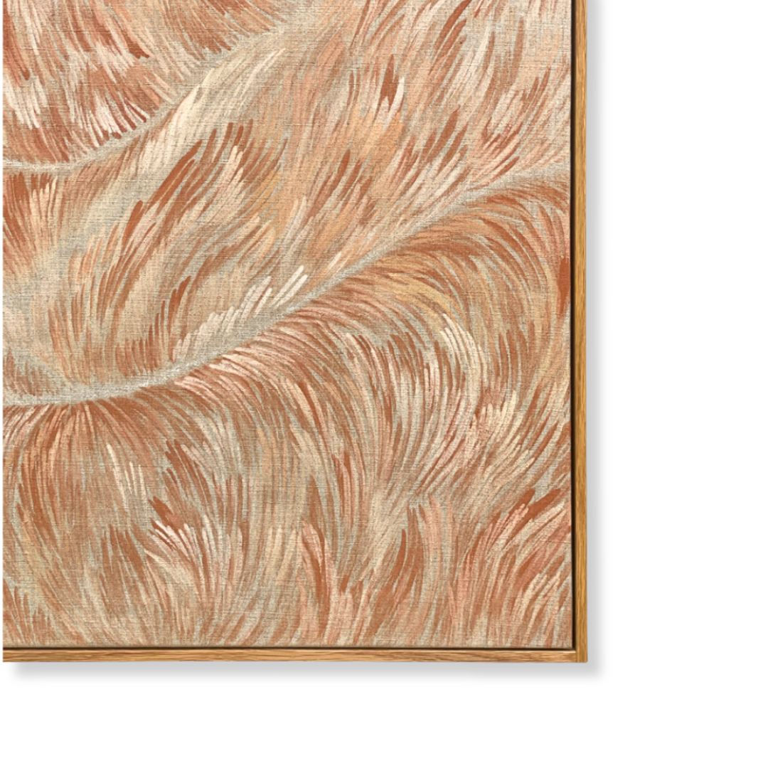 Earth Minerals on linen, framed in a floating natural wood tray frame measuring 79.5 x 69.5 x 4.1 cm. The artwork is ready to hang.