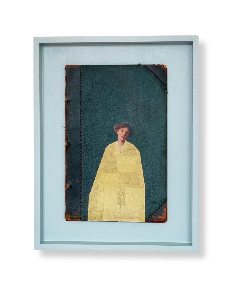 Original hand-cut paper collage using found and vintage papers - created on a vintage book cover.
