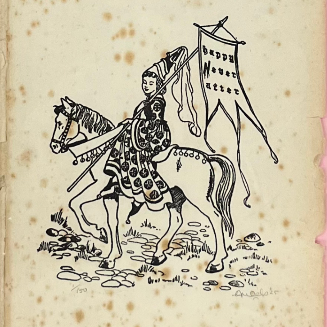 Signed and numbered photopolymer relief print on found vintage book paper (edition 1/150). Each edition is unique as the book paper differs, with marks of age and use.