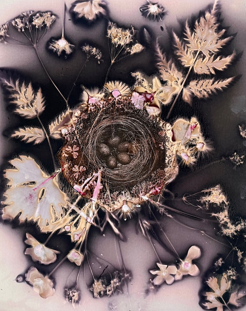 Signed and numbered limited edition giclee print on paper. The image is created from an original lumen print harnessing the power of the sun to expose images and botanicals on paper, with unexpected results.