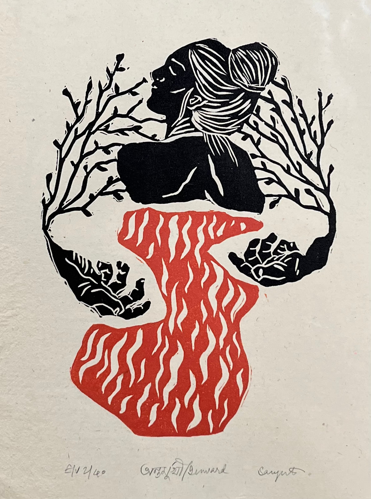Sangeeta Bhagawati is an Indian printmaker now calling London home. She specializes in relief and intaglio printing, weaving her life drawing practice into her printmaking. Central to her work are the mark makings and carvings on the body, which serve as a canvas for exploring themes of pleasure, loss, power, and growth. Her relief and intaglio prints depict bodies in both connection and solitude, inviting viewers to engage with diverse interpretations. Through her carvings and expressive marks, Sangeeta aims to evoke a rich spectrum of emotions, making the human form a focal point of her artistic expression.