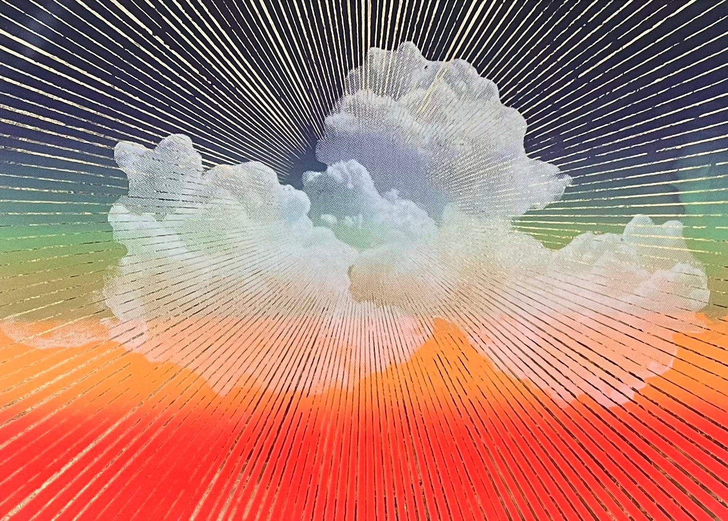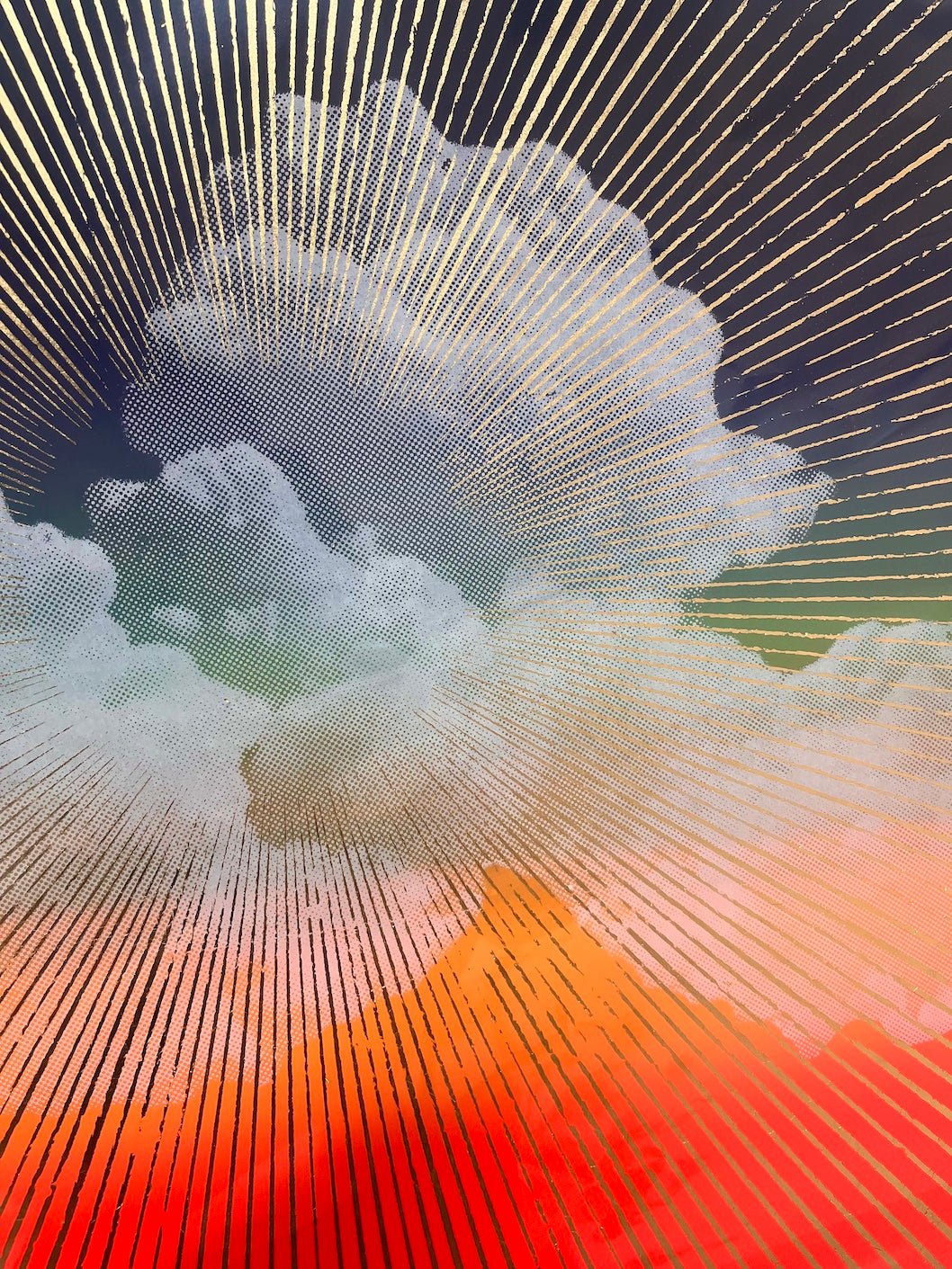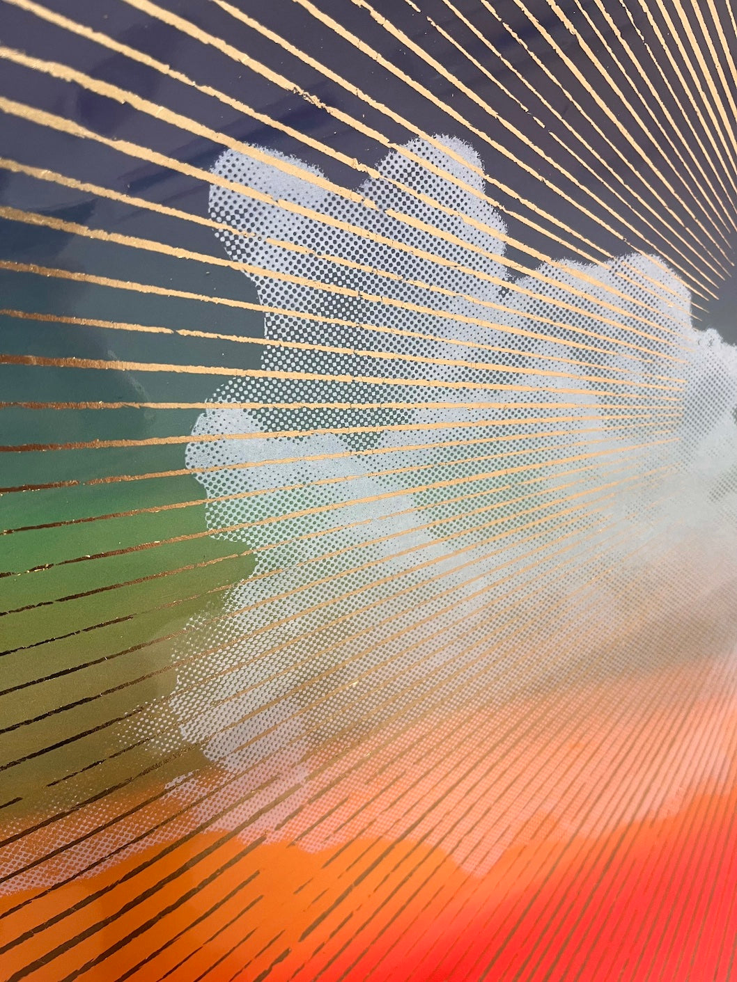 Signed monoprint on 300g Bockingford textured paper, layered with screen-printed clouds and hand-embellished with gold leaf. Due to the print-making process, each edition of this print is unique.