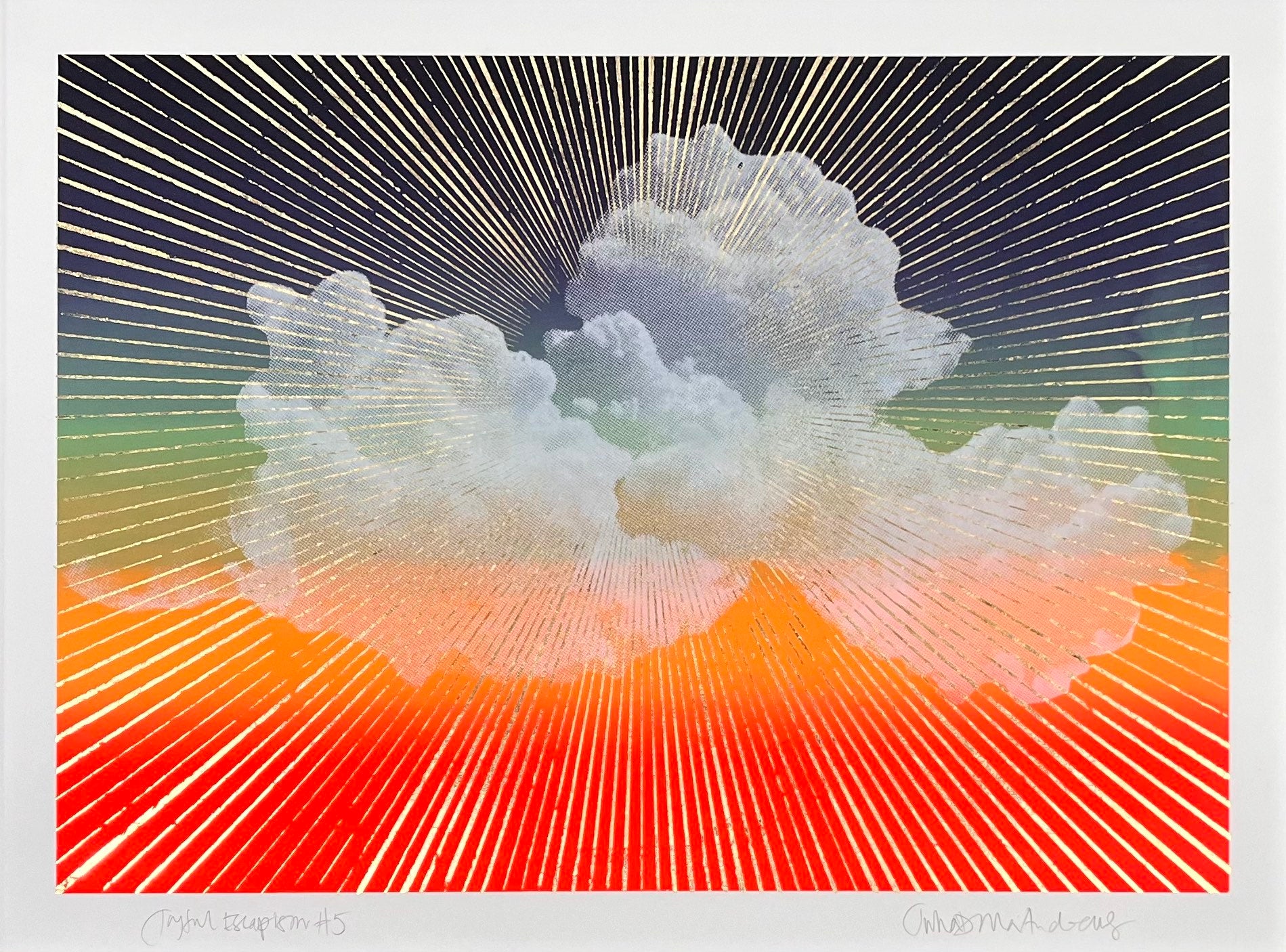 This edition is framed in a matte white frame measuring 69 cm x 52.5 cm. It is behind low reflect UV filter glass in order to enhance the shine of the gold leaf and protect the piece from light damage over time.