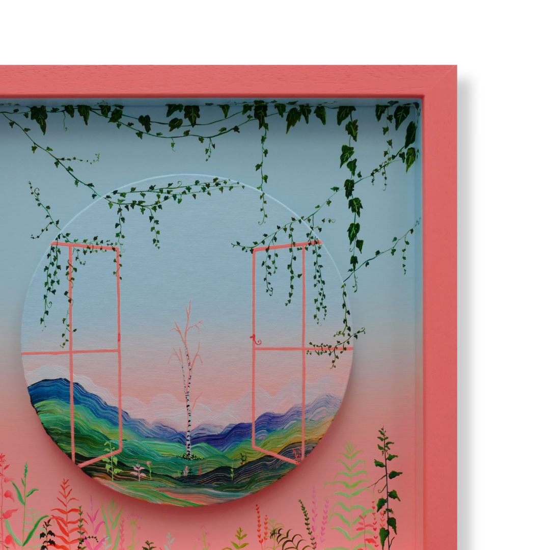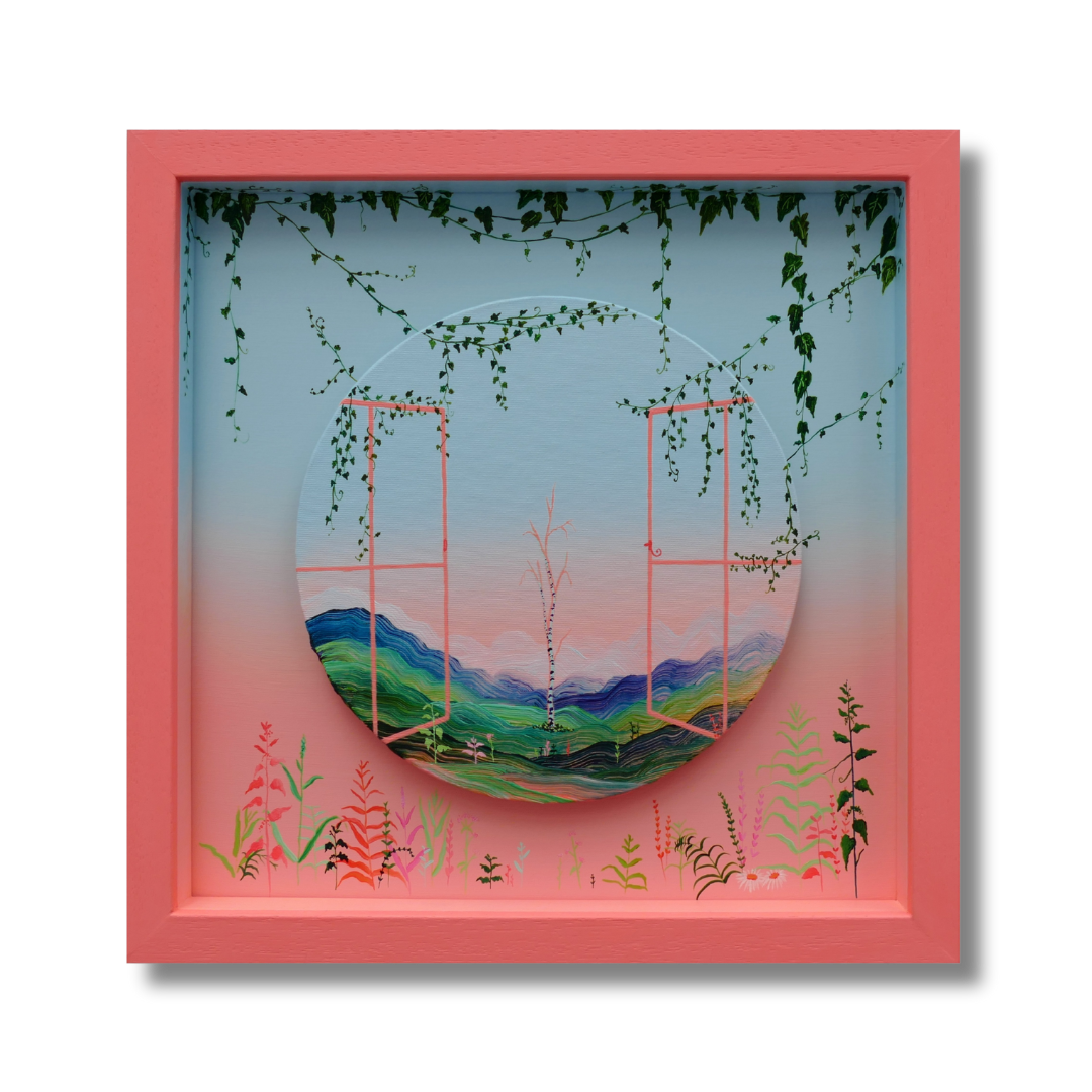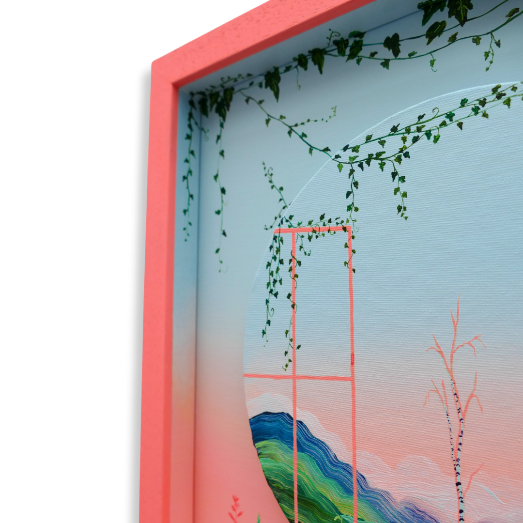 This artwork captures the small pleasure and daily habit of looking out the window. We can often spend days on end cooped up indoors for various reasons. It can start to feel insular and begin to play on our anxieties. Something as simple as situating yourself next to an open window and allowing your mind to drift outside and in turn for nature to metaphorically creep inside can do wonders for the soul.