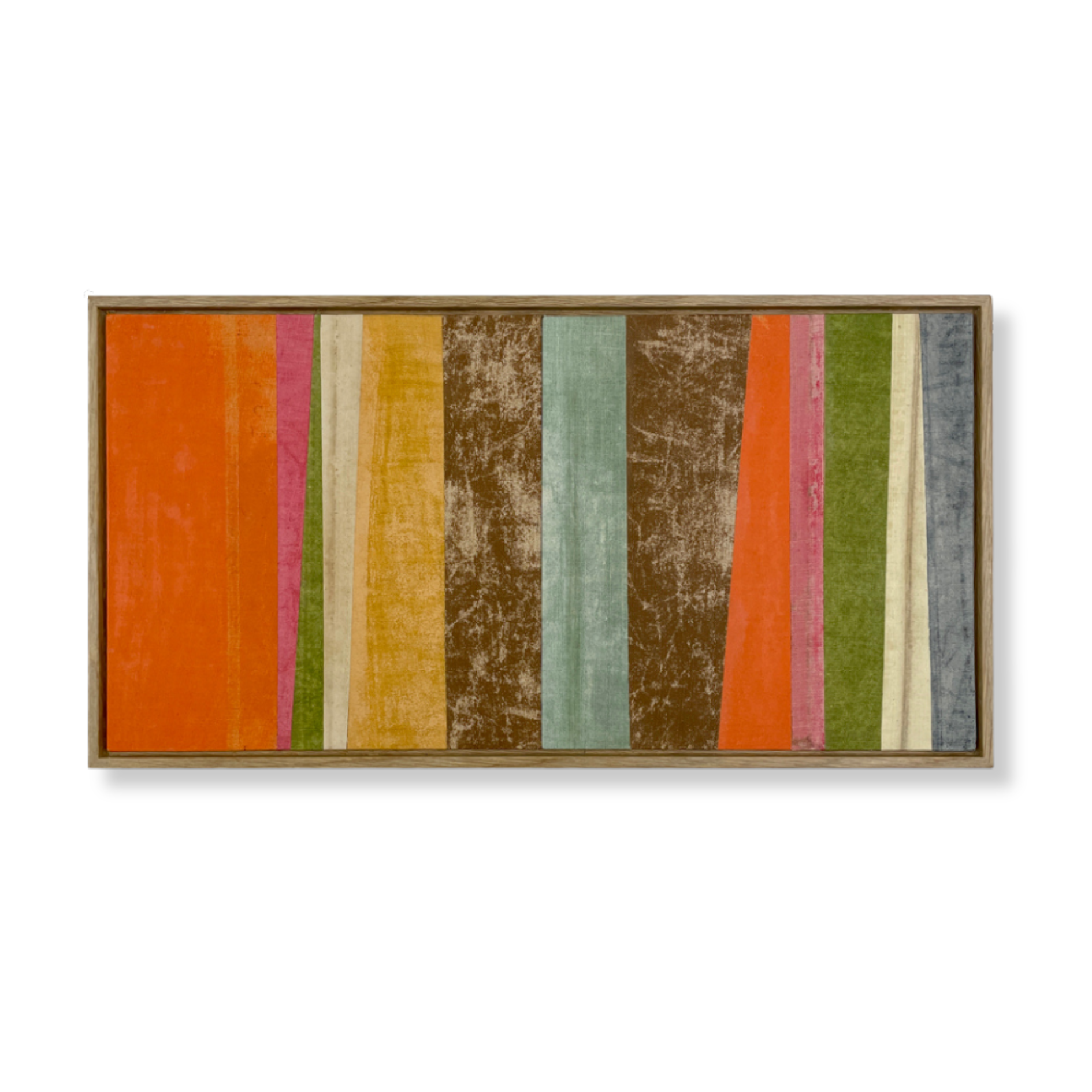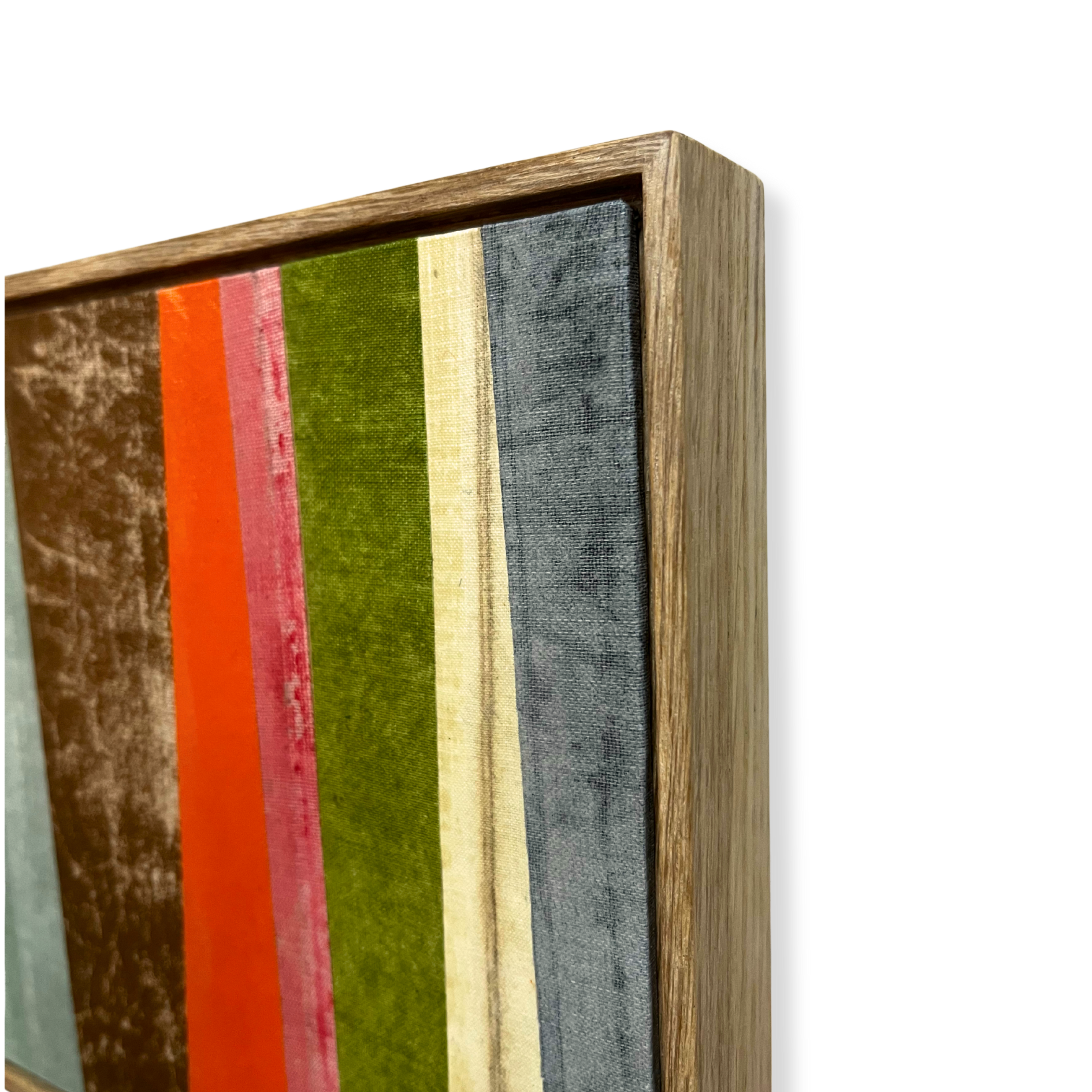 Original artwork created from vintage book cloth on board, framed floating within a handmade sustainably sourced slim oak tray frame (no glass)