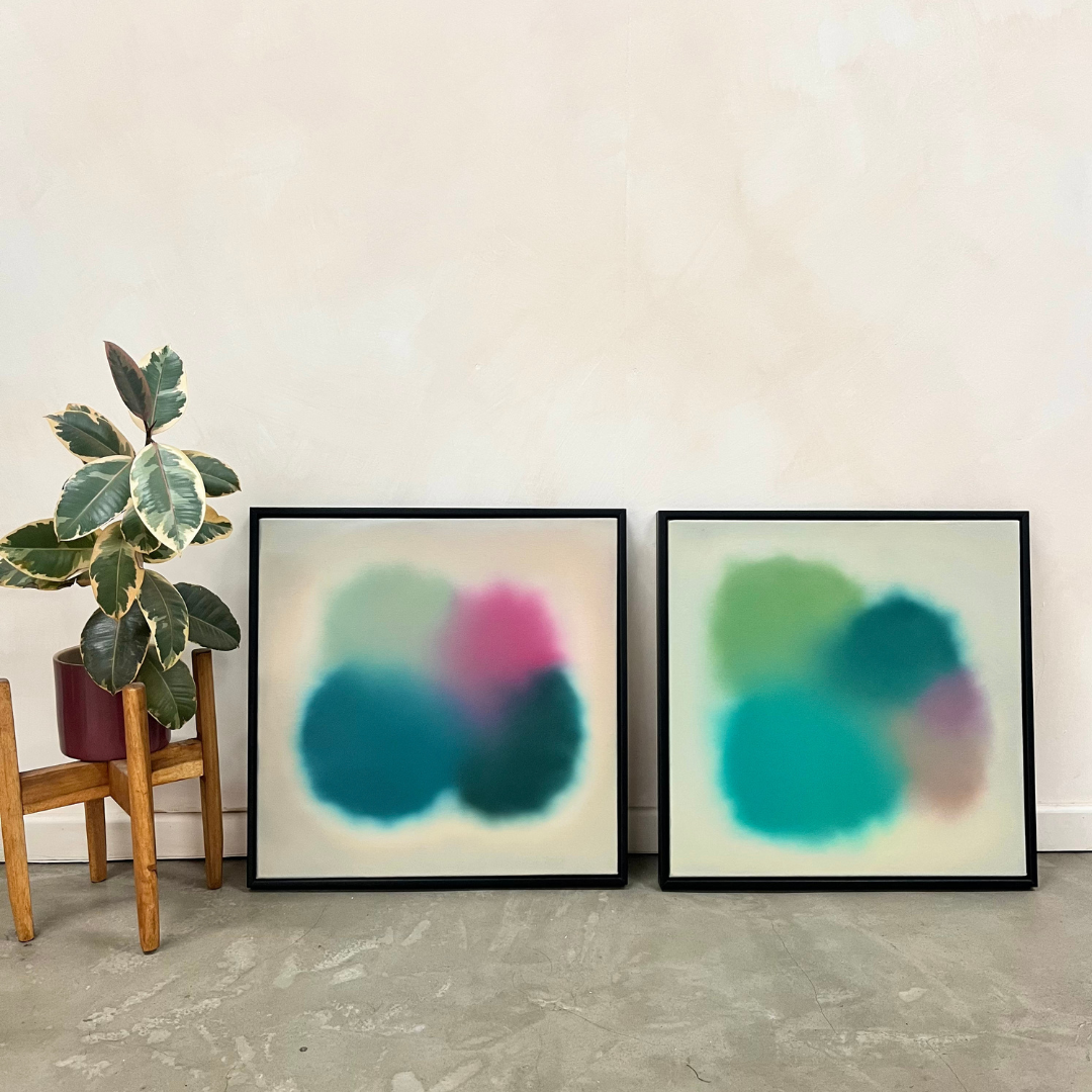 For this series Nicole Rose has taken inspiration from her regular dog walks - a slice of her daily routine. Where Nicole usually paints in response to the views of the natural world around her, here she maps her walking routes, thinking about the overhead views. These tactile, circular and blended shapes offer us an abstracted representation of a joyful ritual. A ritual which speaks to the importance of nature, physical activity and our much-loved pets for our wellbeing.