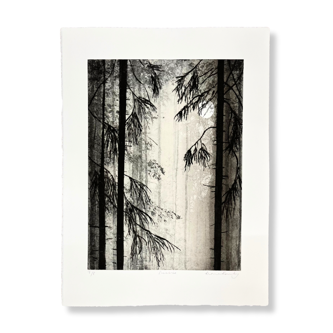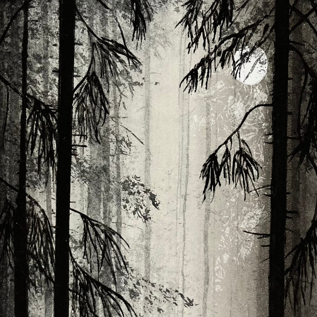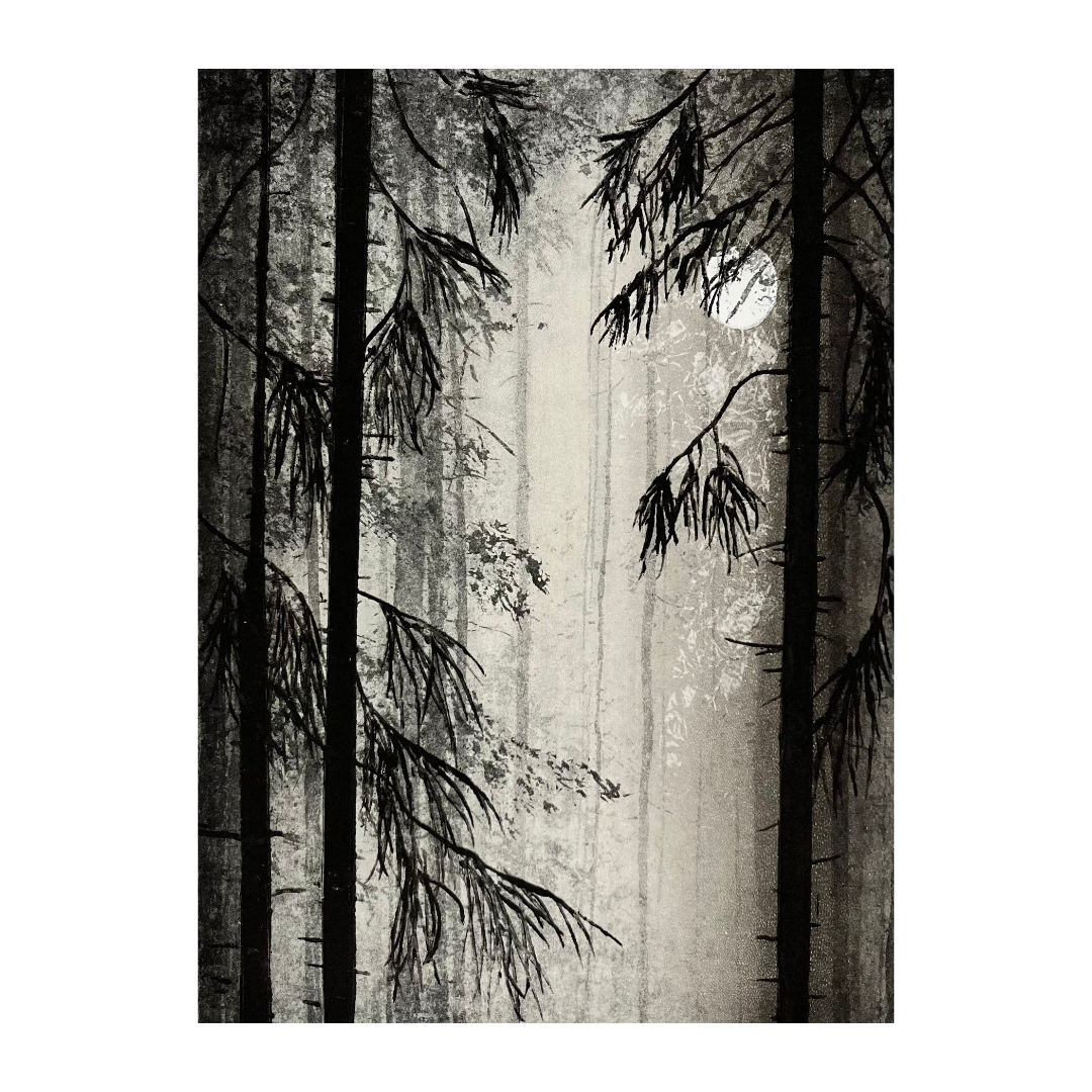 Through Fiona’s deeply atmospheric and evocative original monotypes, we step into the forest. Into the unknown, the wild and a space laden with metaphysical meaning and narrative. An important symbol for Fiona, the forest is both a mysterious, haunting place full of uncertainty and fragility, and a healing, restorative space for the planet and the individual.