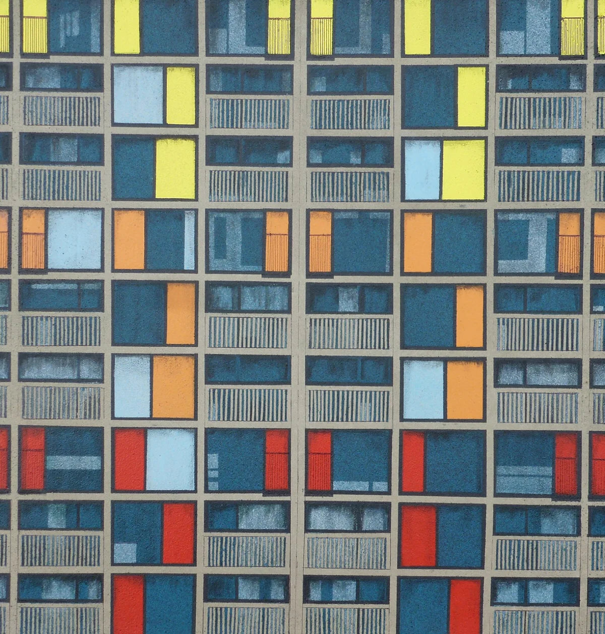 Mandy’s immaculately painted artworks pay close attention to the urban landscape, focusing on Brutalist architecture to explore issues like gentrification and social class. She refuses to overlook the mundane and instead enjoys documenting housing estates in transition - parts of which are continually lost alongside the displacement of their inhabitants.