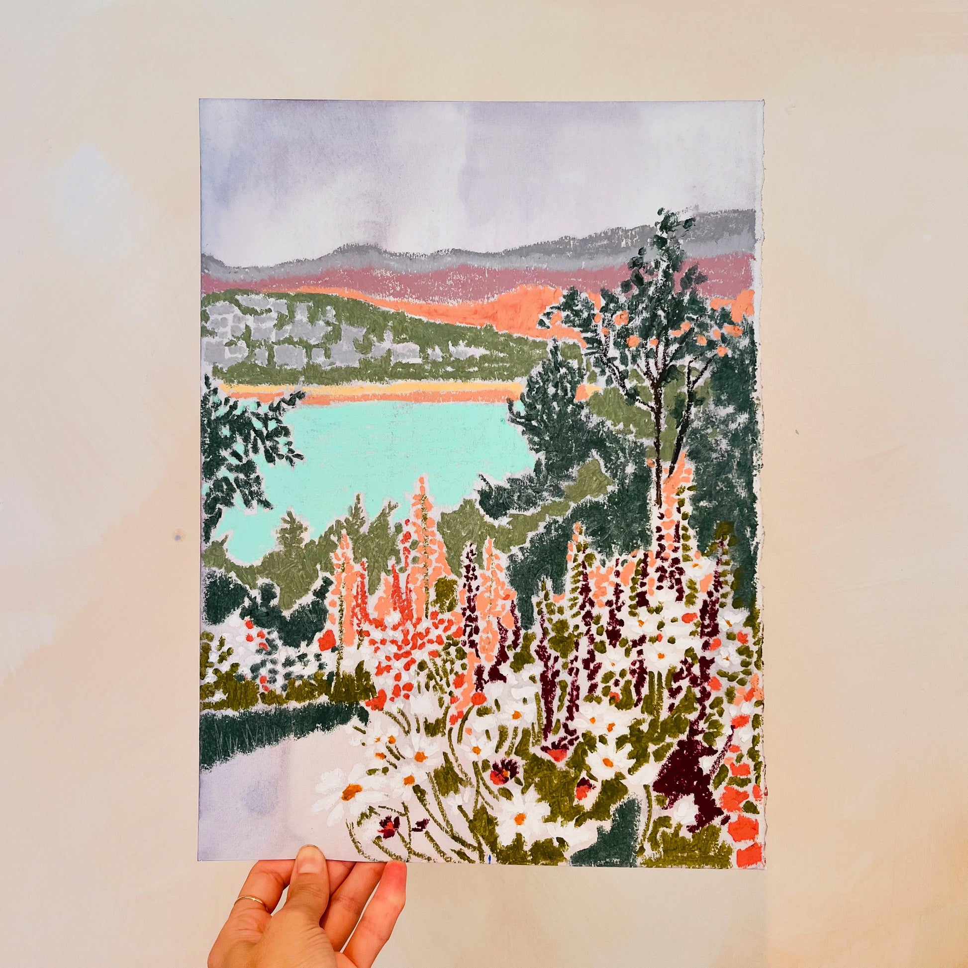 Original watercolour and oil pastel artwork on paper. This artwork is framed to conservation standard - float mounted within a natural cherry wood box frame behind low reflect glass. The framed size is 32 x 37 cm.