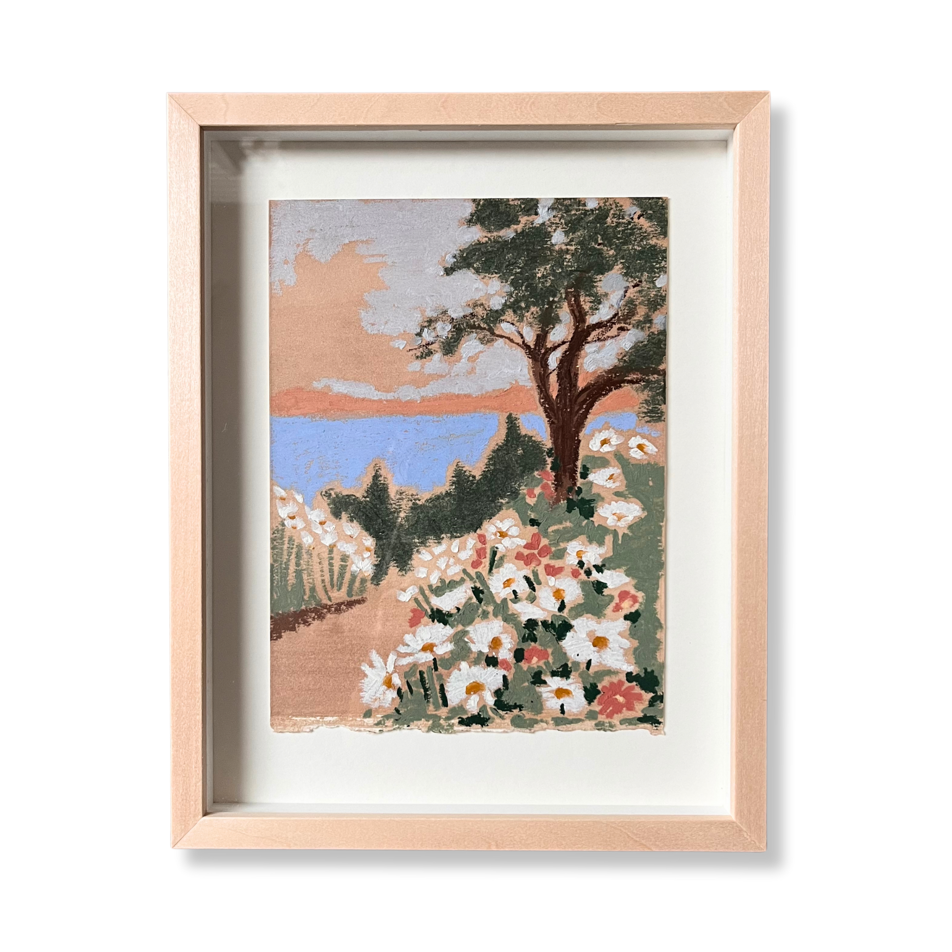 This artwork is framed floated on a soft white mount within a natural wood box frame.