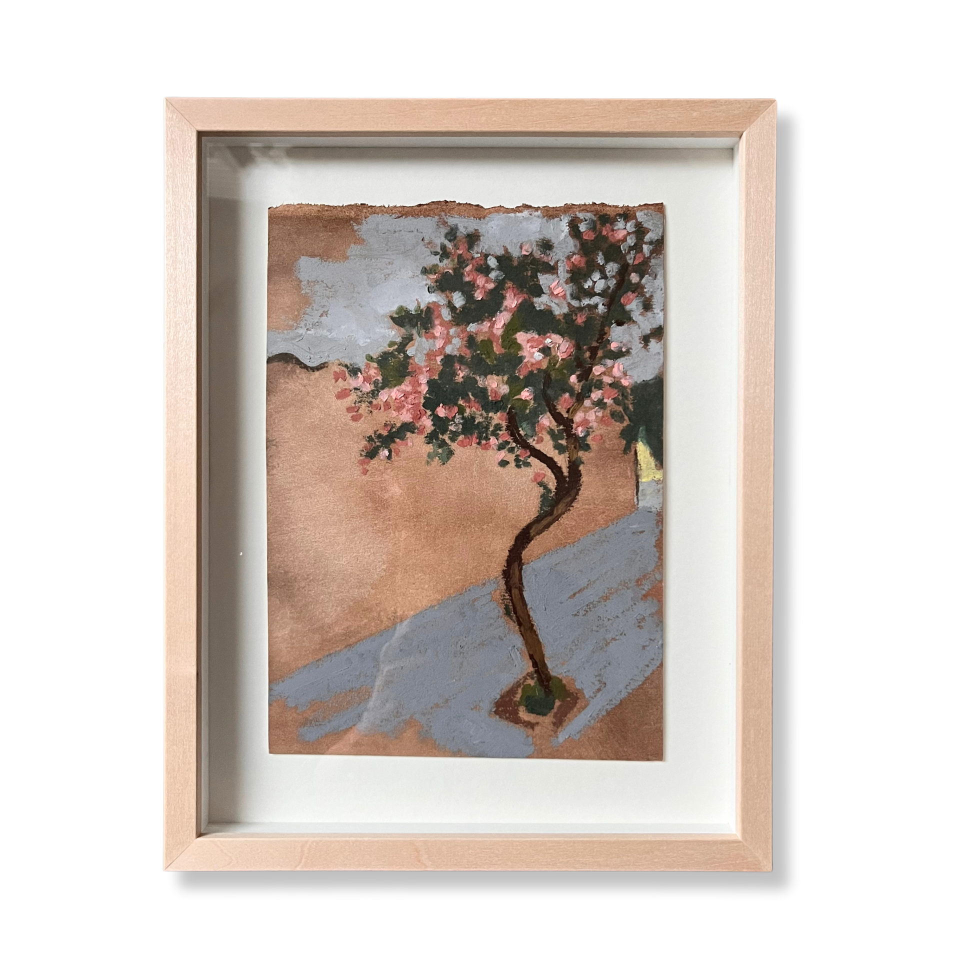 Original watercolour and oil pastel artwork on paper, framed float mounted within a natural wood box frame measuring 22.3 x 28.3 cm.