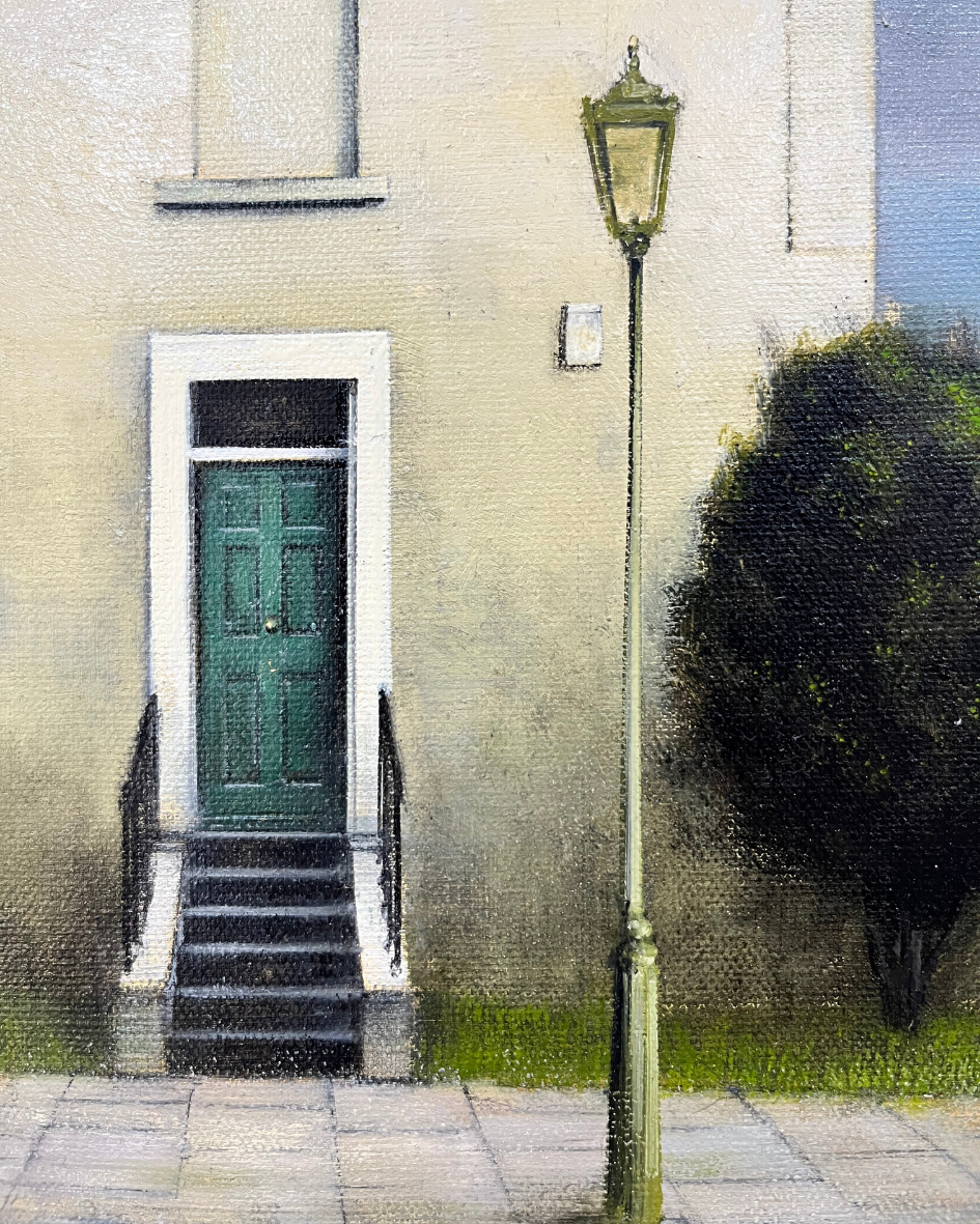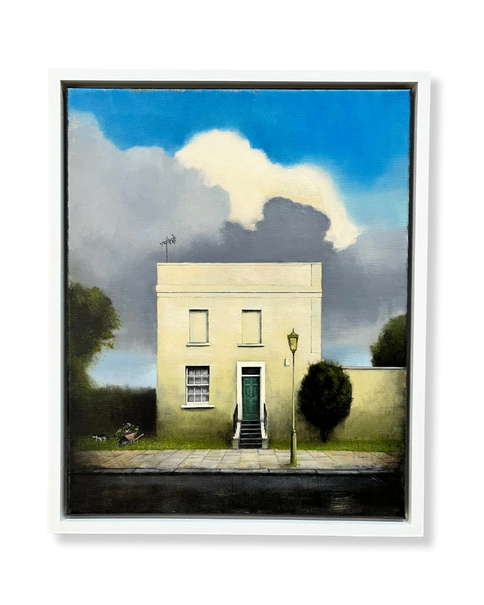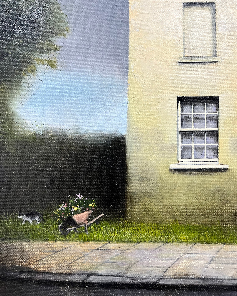 Looking closely at light and shadow, Chris blends painterly realism with intriguing narrative. He pays attention to the everyday, the half-noticed and the overlooked. From an isolated building next to a canal to an unremarkable row of houses - Chris collects imagery which has sparked his imagination and transforms it. By placing these single houses into unexpected rural spaces he changes the context and thus creates a new narrative - steeped in otherness, nostalgic beauty and a hint of the surreal. A black and white cat traces his every step.