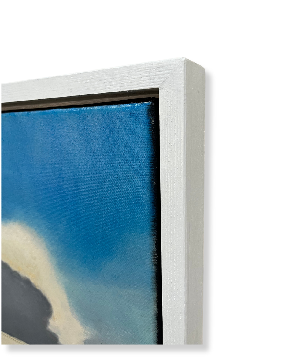 Original oil on canvas, framed in a floating white wood tray frame measuring 44 x 54 cm.
