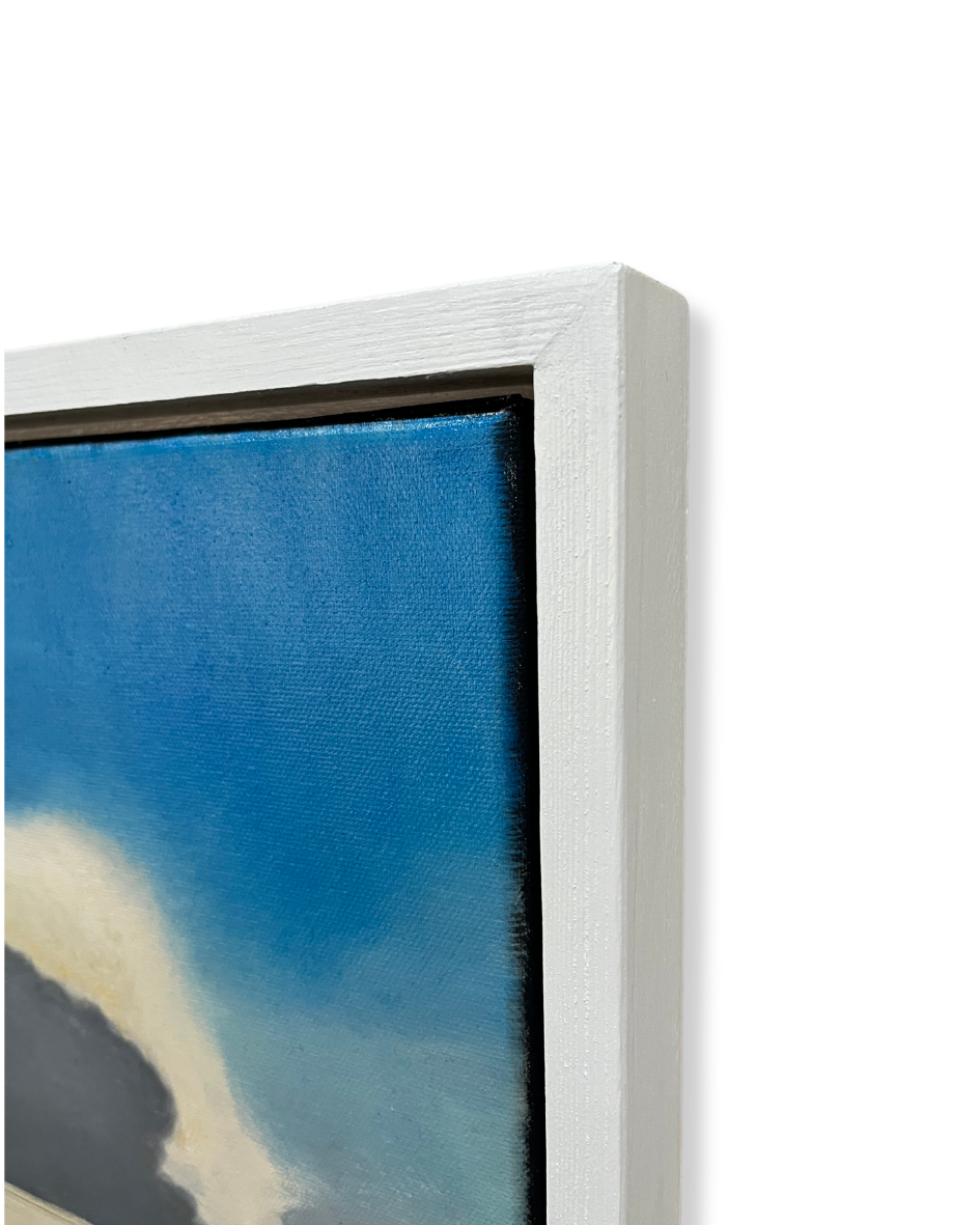 Original oil on board, framed in a floating white wood tray frame measuring 20.5 x 25 cm.