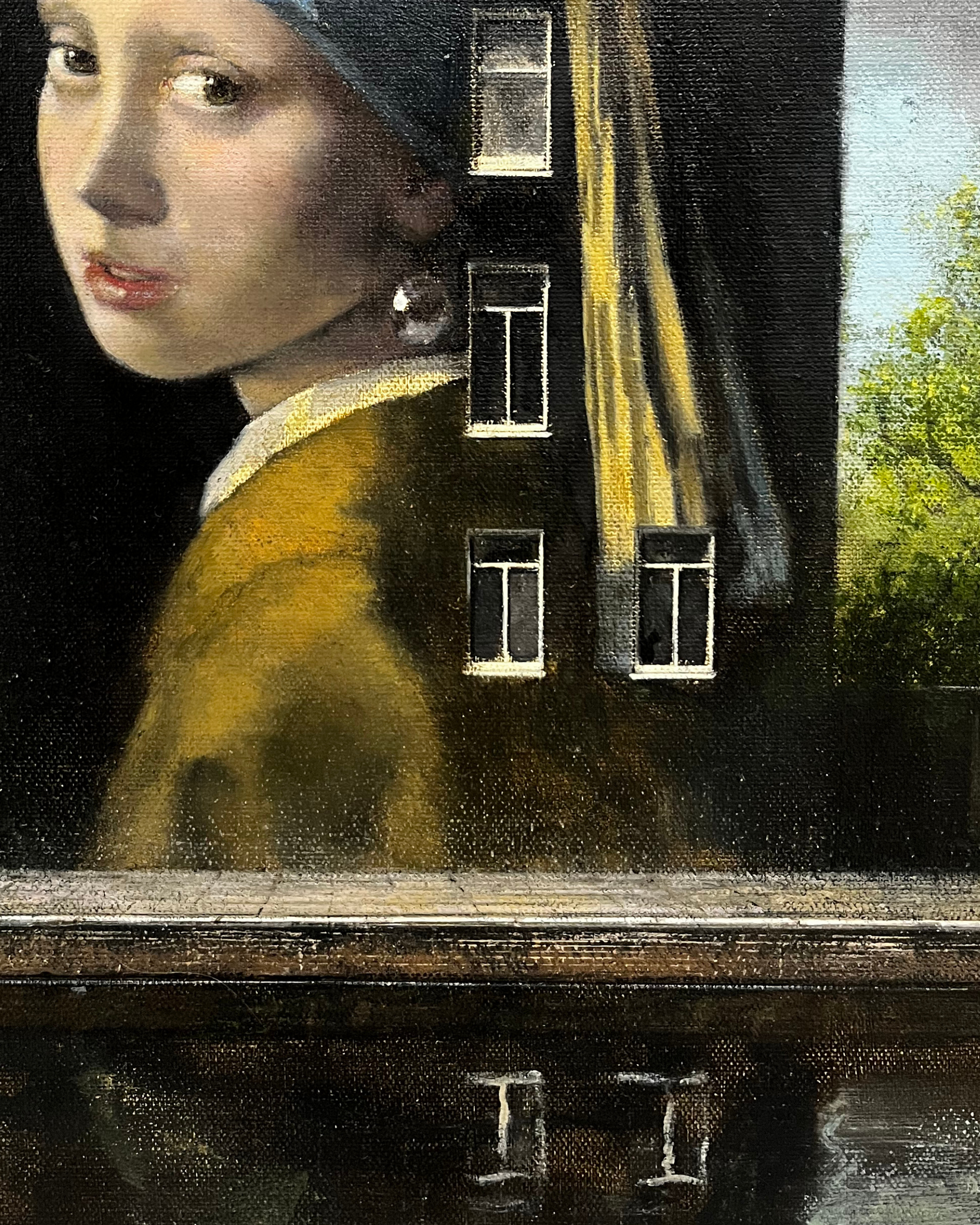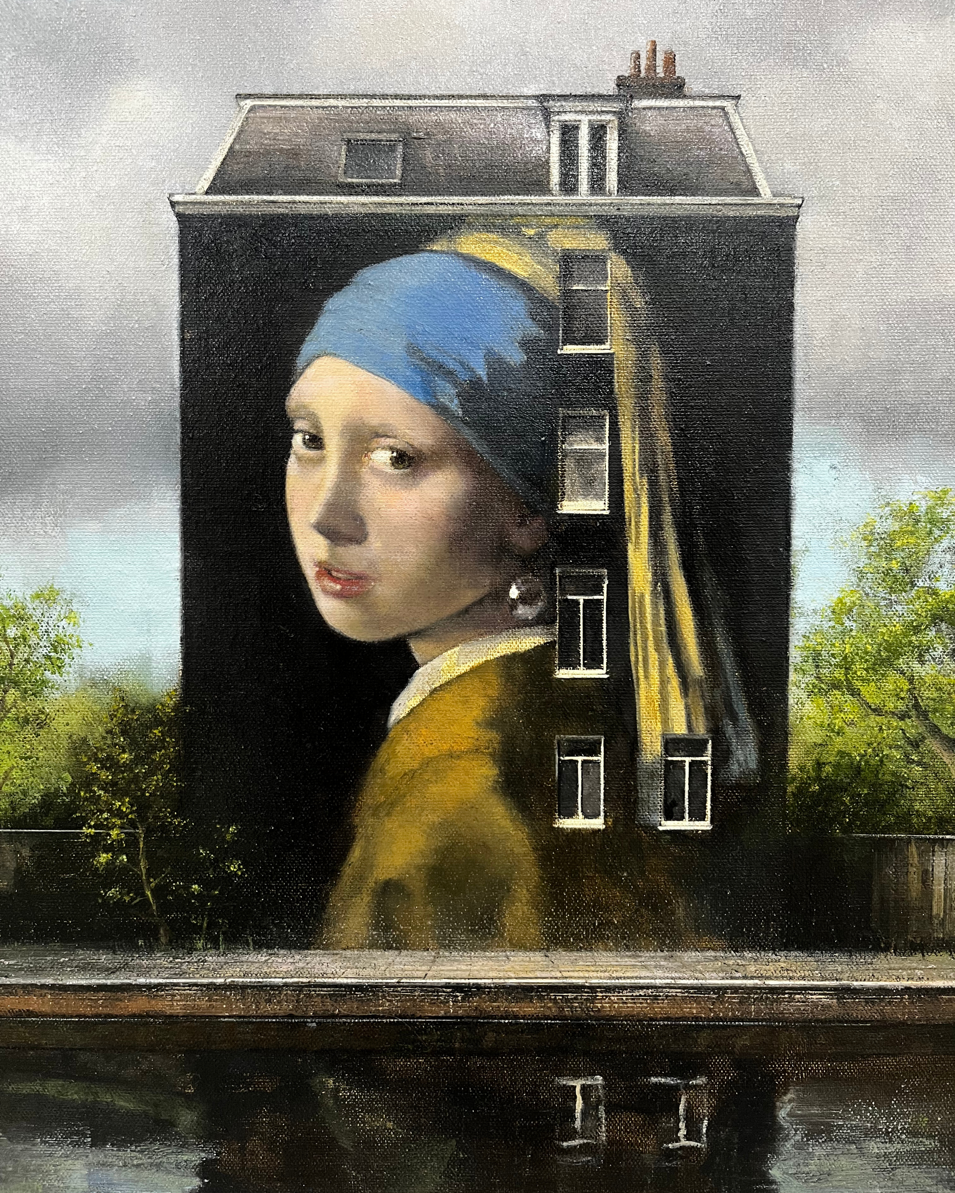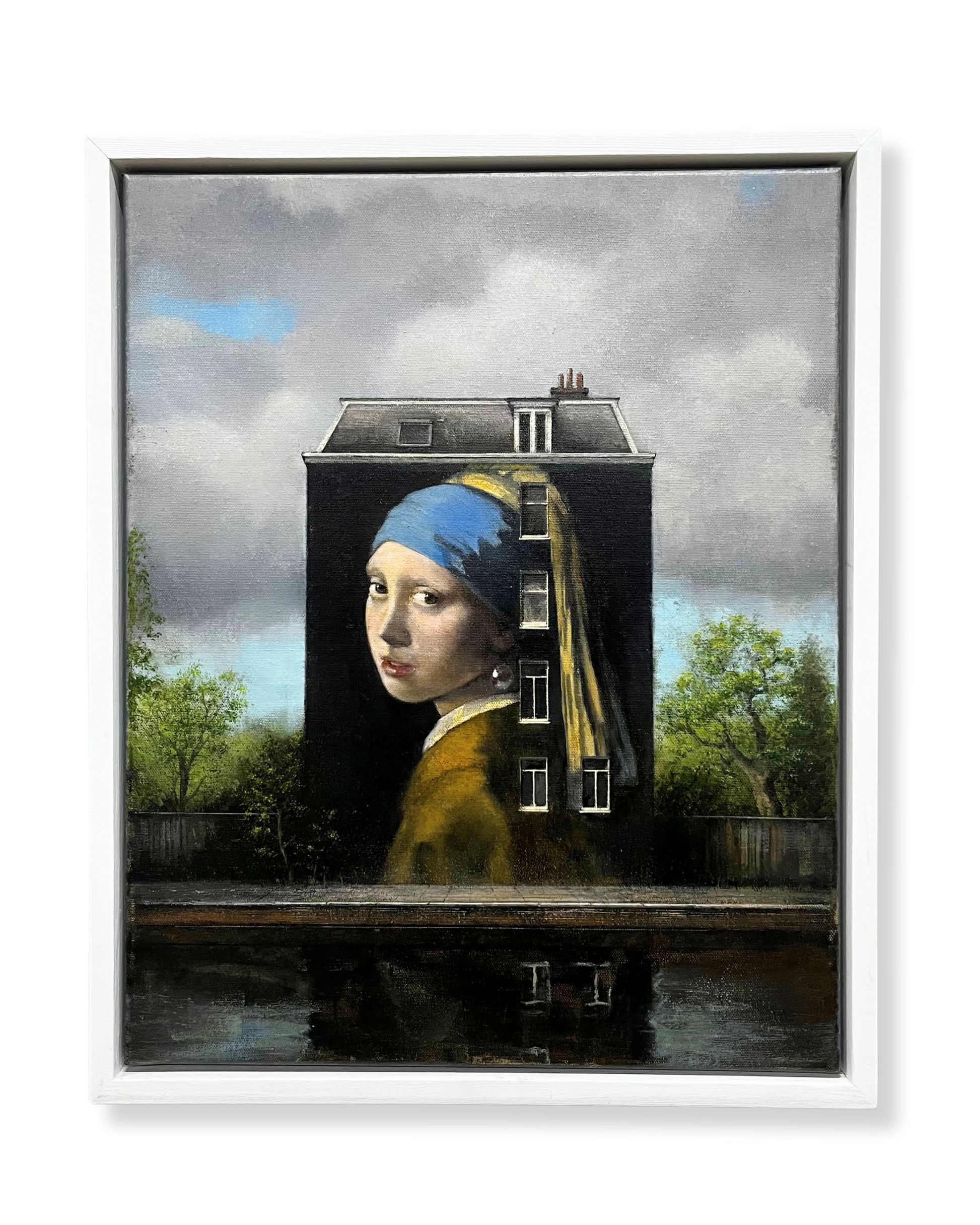 Part of a new series of works which combine Chris's architectural house paintings with his flair for portraiture, this house is inspired by a building in Amsterdam. For this collection of works Chris draws on inspiration from the history of art, in this case Vermeer. The extraordinary and beautifully painted portrait is rendered as if it is a mural on the building's dark facade.