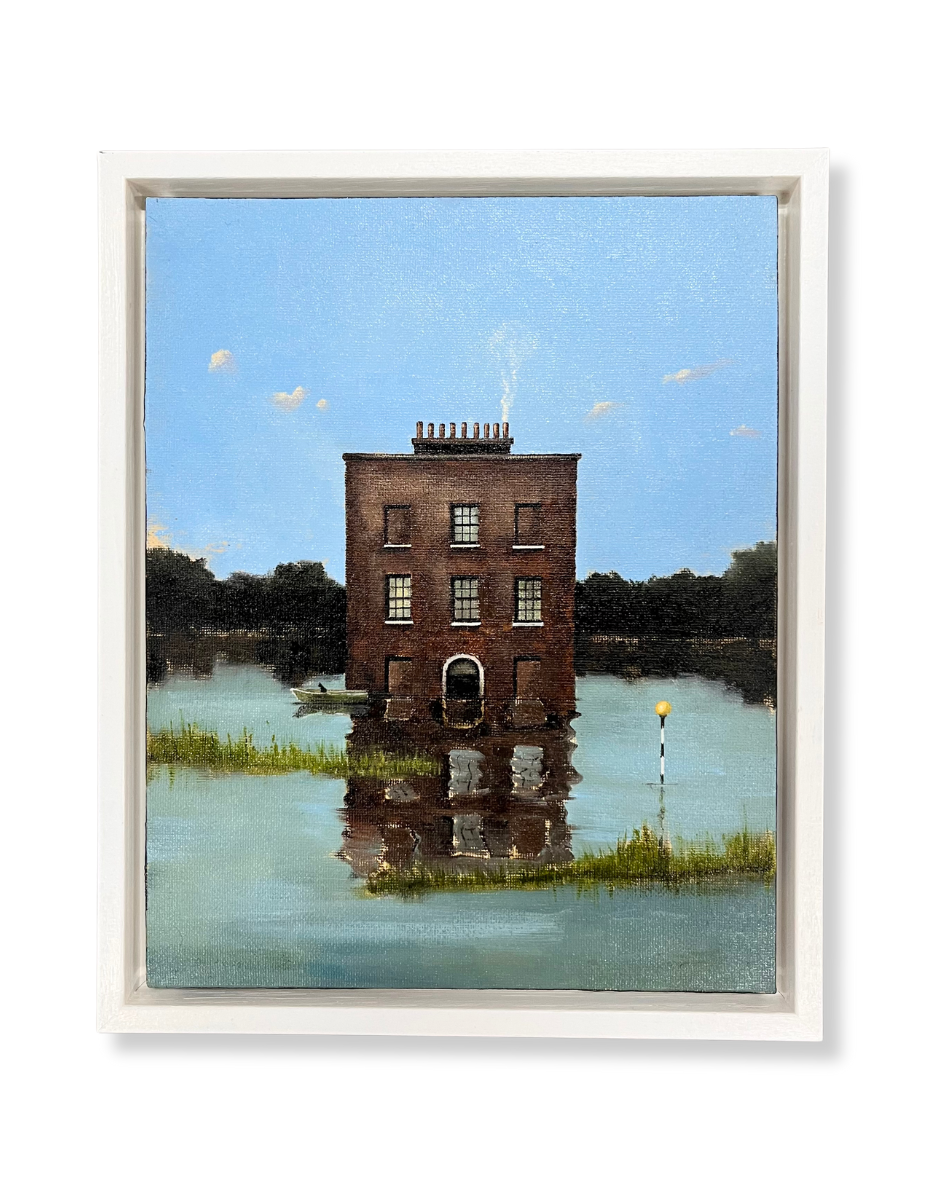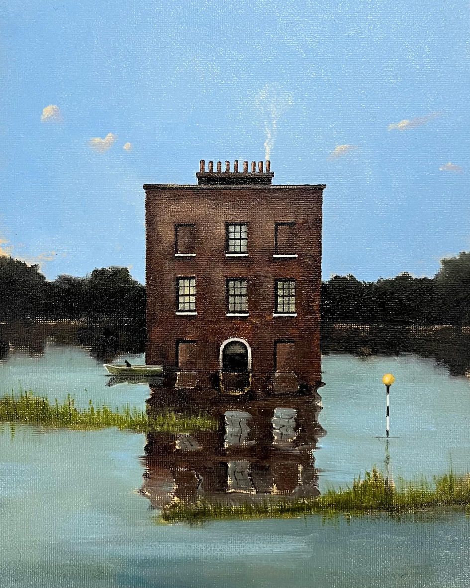 Looking closely at light and shadow, Chris blends painterly realism with intriguing narrative. He pays attention to the everyday, the half-noticed and the overlooked. From an isolated building next to a canal to an unremarkable row of houses - Chris collects imagery which has sparked his imagination and transforms it. By placing these single houses into unexpected rural spaces he changes the context and thus creates a new narrative - steeped in otherness, nostalgic beauty and a hint of the surreal. A black and white cat traces his every step.