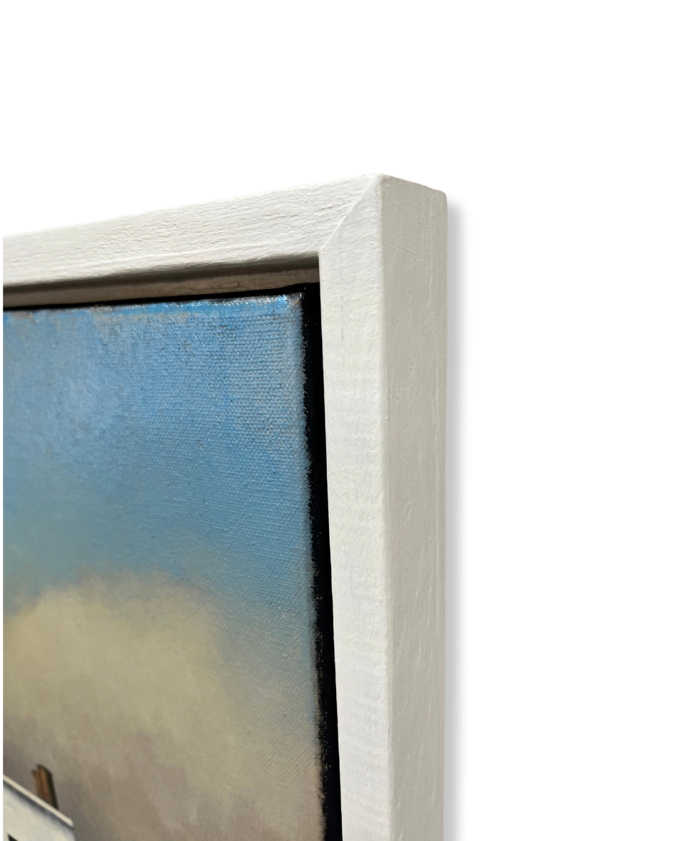 Original oil on canvas, framed in a floating white wood tray frame measuring 44 x 54 cm.
