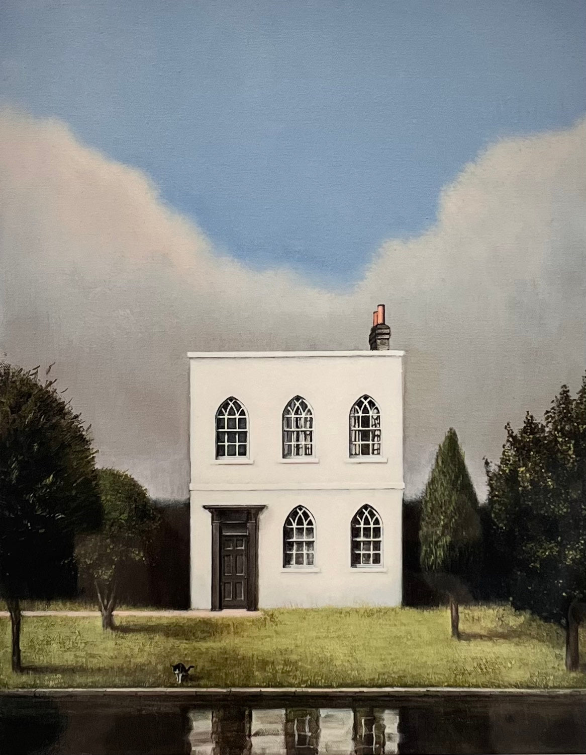 Looking closely at light and shadow, Chris blends painterly realism with intriguing narrative. He pays attention to the everyday, the half-noticed and the overlooked. From an isolated building next to a canal to an unremarkable row of houses - Chris collects imagery which has sparked his imagination and transforms it. By placing these single houses into unexpected rural spaces he changes the context and thus creates a new narrative - steeped in otherness, nostalgic beauty and a hint of the surreal. A black and white cat traces his every step.