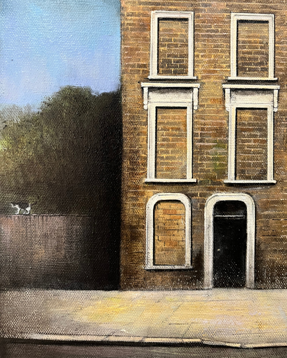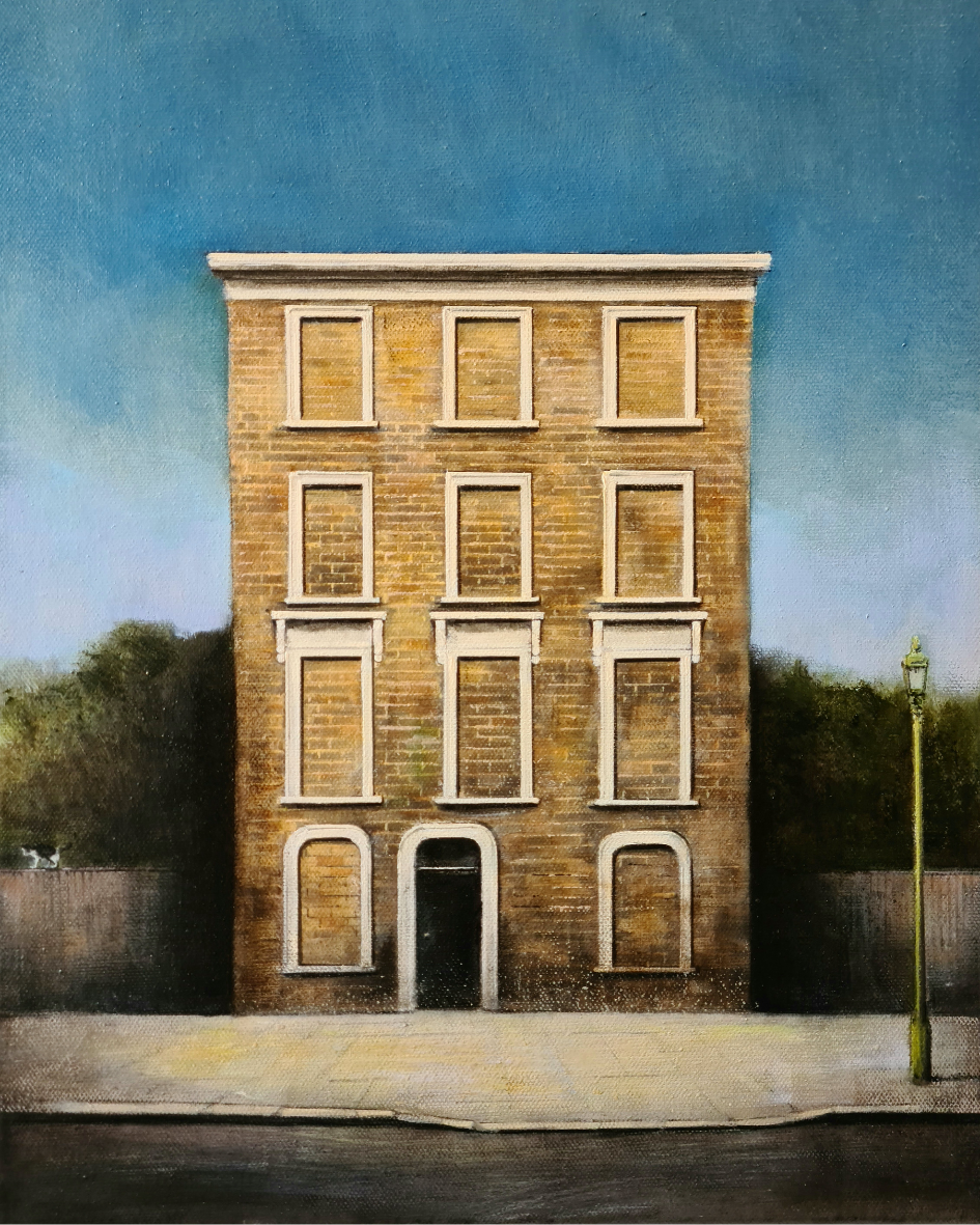 For this painting Chris revisited a street he had previously discovered when creating a painting called ‘The Magician’s House’ - a suitable neighbour. Much like ‘The Arborealist’s House’, the striking impact of this facade means that very little has been changed as Chris leans into its natural dissonance. Despite being grounded in the reality of the window tax imposed by King William III, visually there is a playfulness which means the painting feels at home in Surrealism. The house feels locked up and disconnected - a strange echo to the mysterious inhabitant and their need for a different kind of sight.