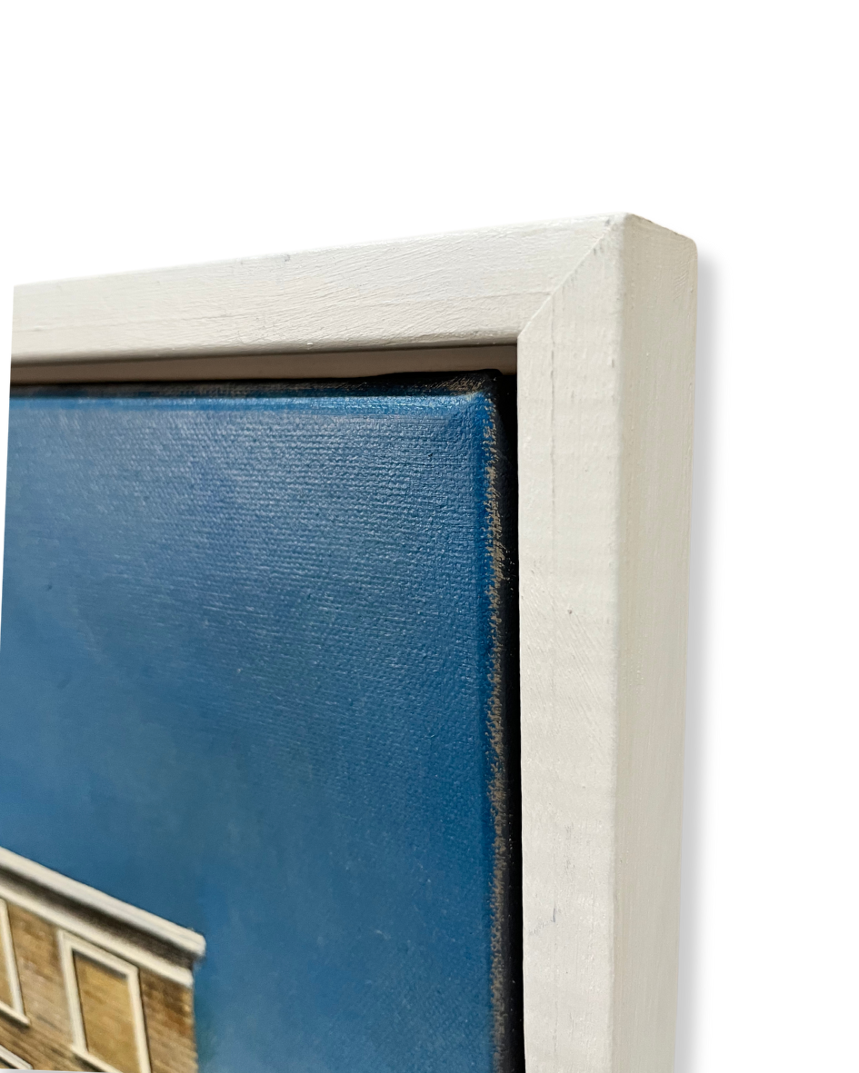 Original oil on canvas, framed in a floating white wood tray frame measuring 34 x 44 cm.