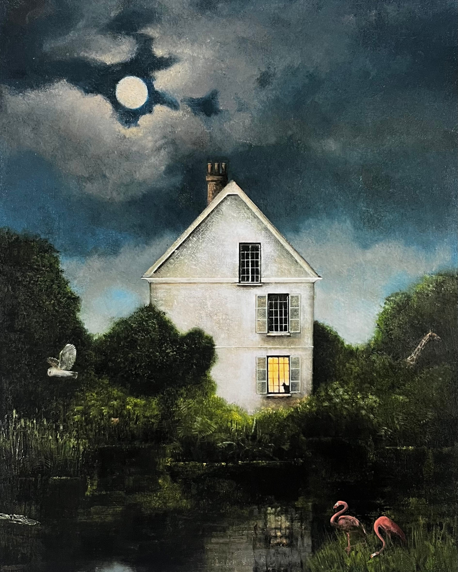 Looking closely at light and shadow, Chris blends painterly realism with intriguing narrative. He pays attention to the everyday, the half-noticed and the overlooked. From an isolated building next to a canal to an unremarkable row of houses - Chris collects imagery which has sparked his imagination and transforms it. By placing these single houses into unexpected rural spaces he changes the context and thus creates a new narrative - steeped in otherness, nostalgic beauty and a hint of the surreal. A black and white cat traces his every step.