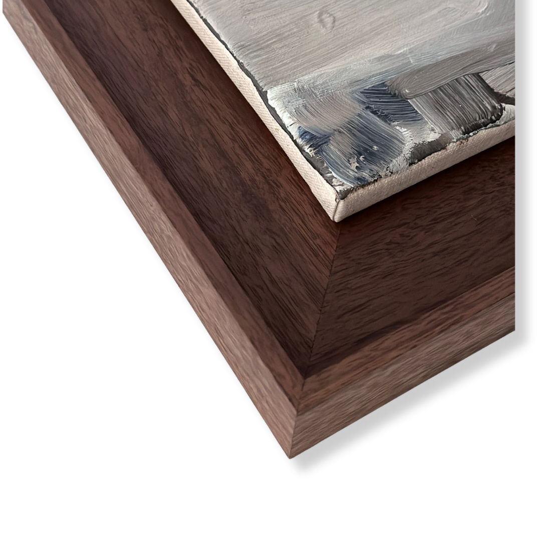 This artwork is painted on stretched linen and framed floated in a custom walnut frame.
