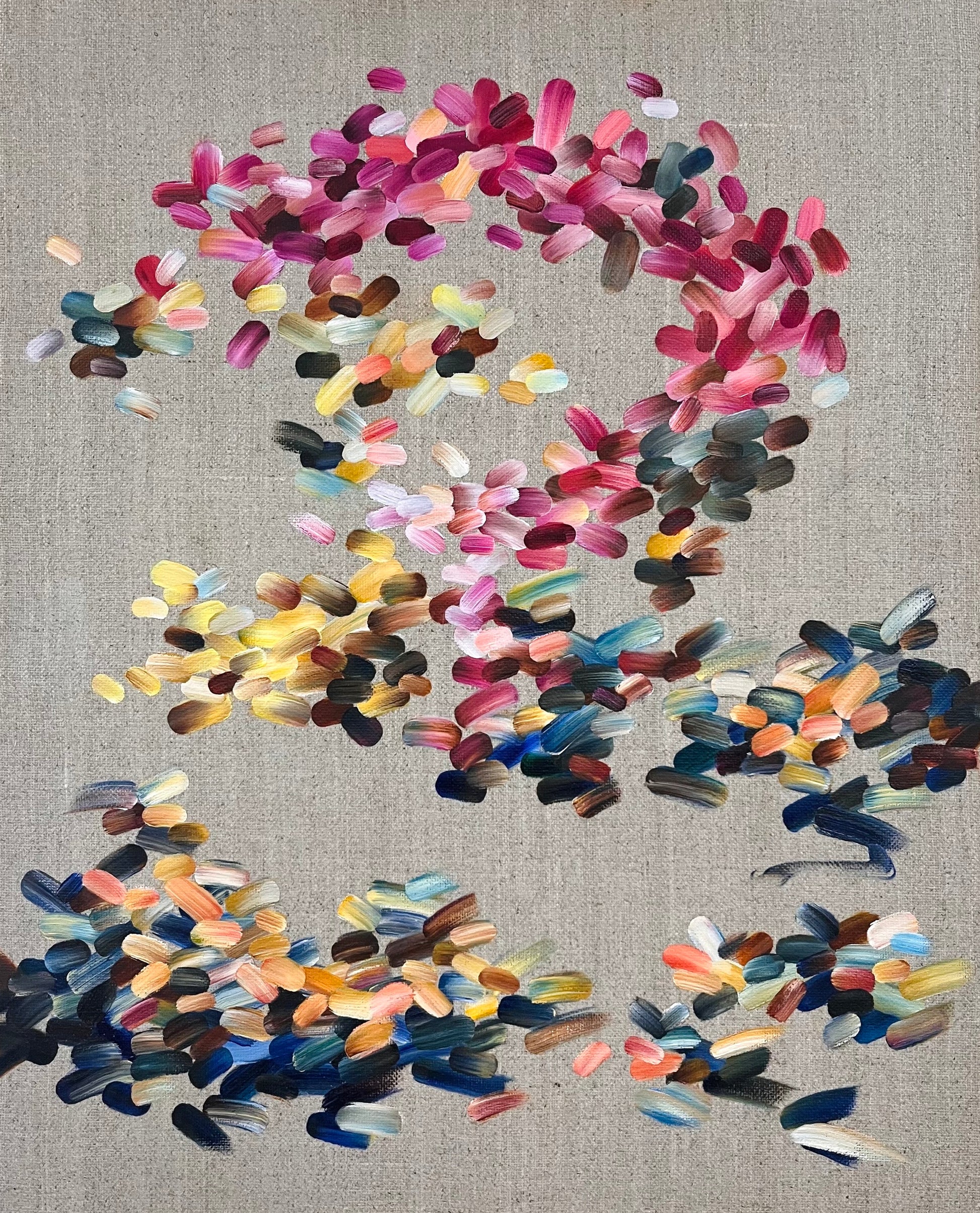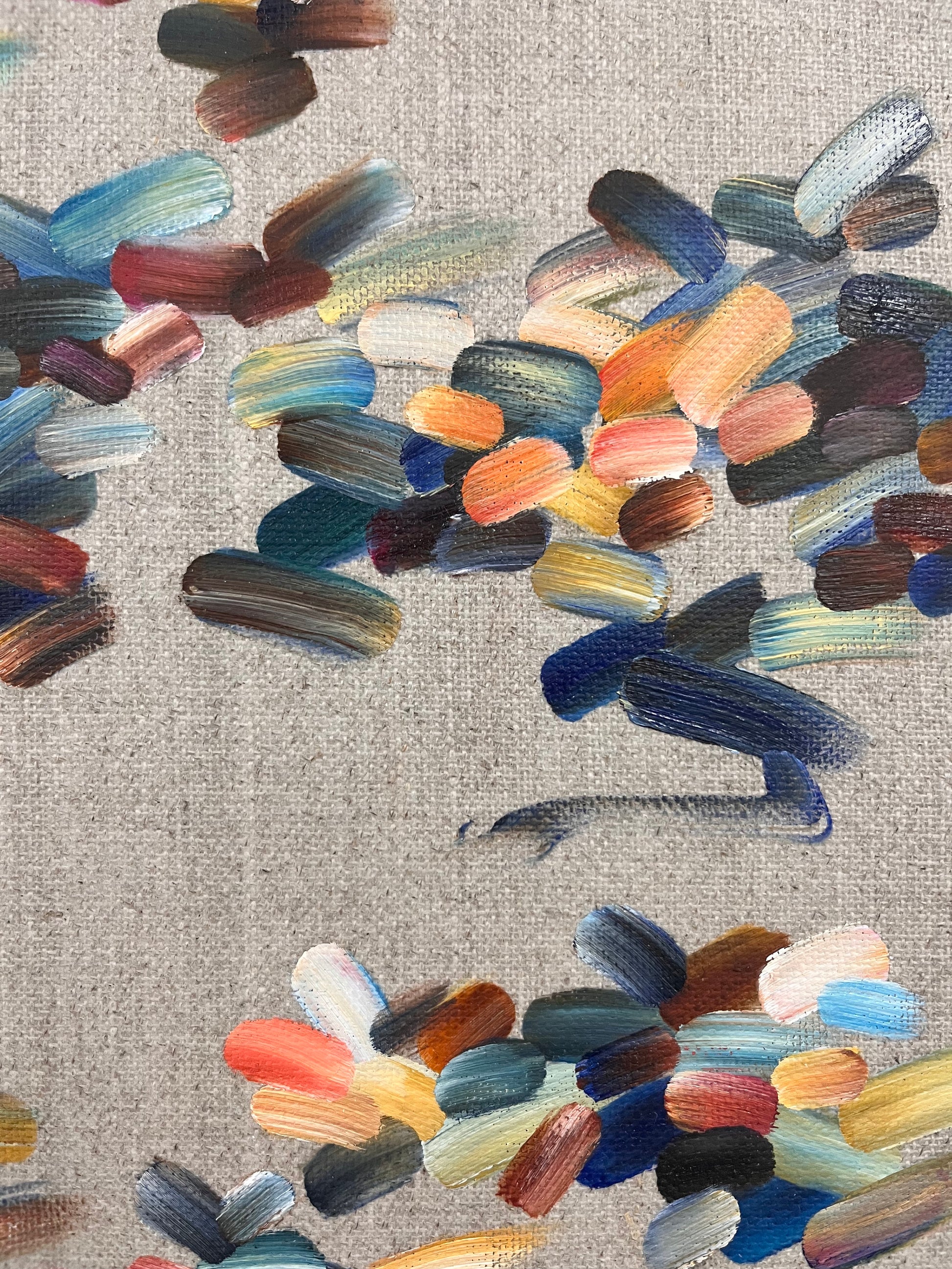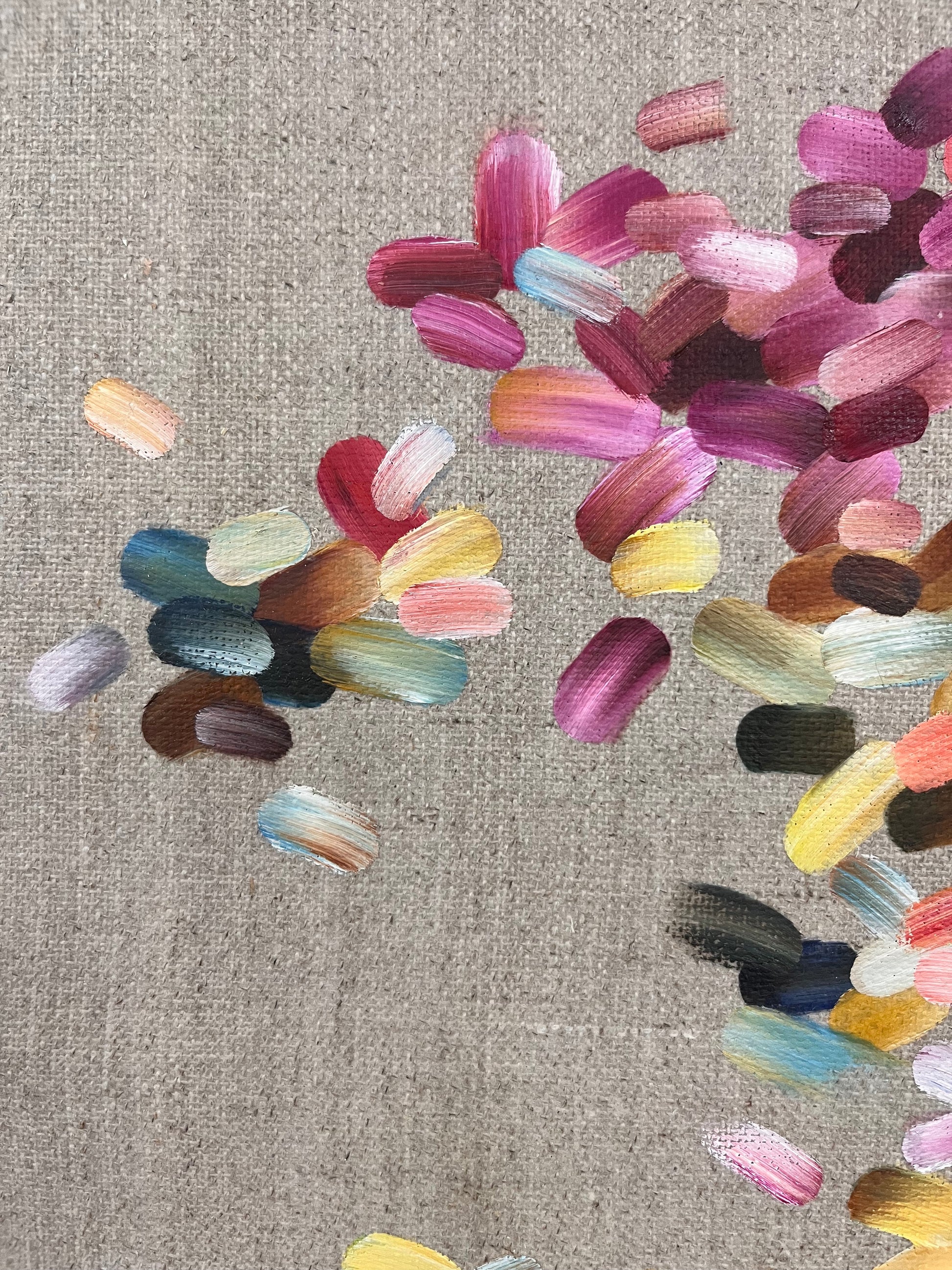Based in Walthamstow, East London, Xuan creates vivid works which dance between abstraction and representation. Her unique marks are meticulously applied - held within these tiny brushstrokes are miniature worlds of carefully blended tones, full of movement and texture. These marks act like fragments, gently sculpting an abstract expressionist language which is influenced by light, the natural world and the subconscious mind. Using various source images, from master paintings to photographs, Xuan lets intuition and the process of painting guide her organically - the joy she finds in the creation of the work evident in the finished piece.
