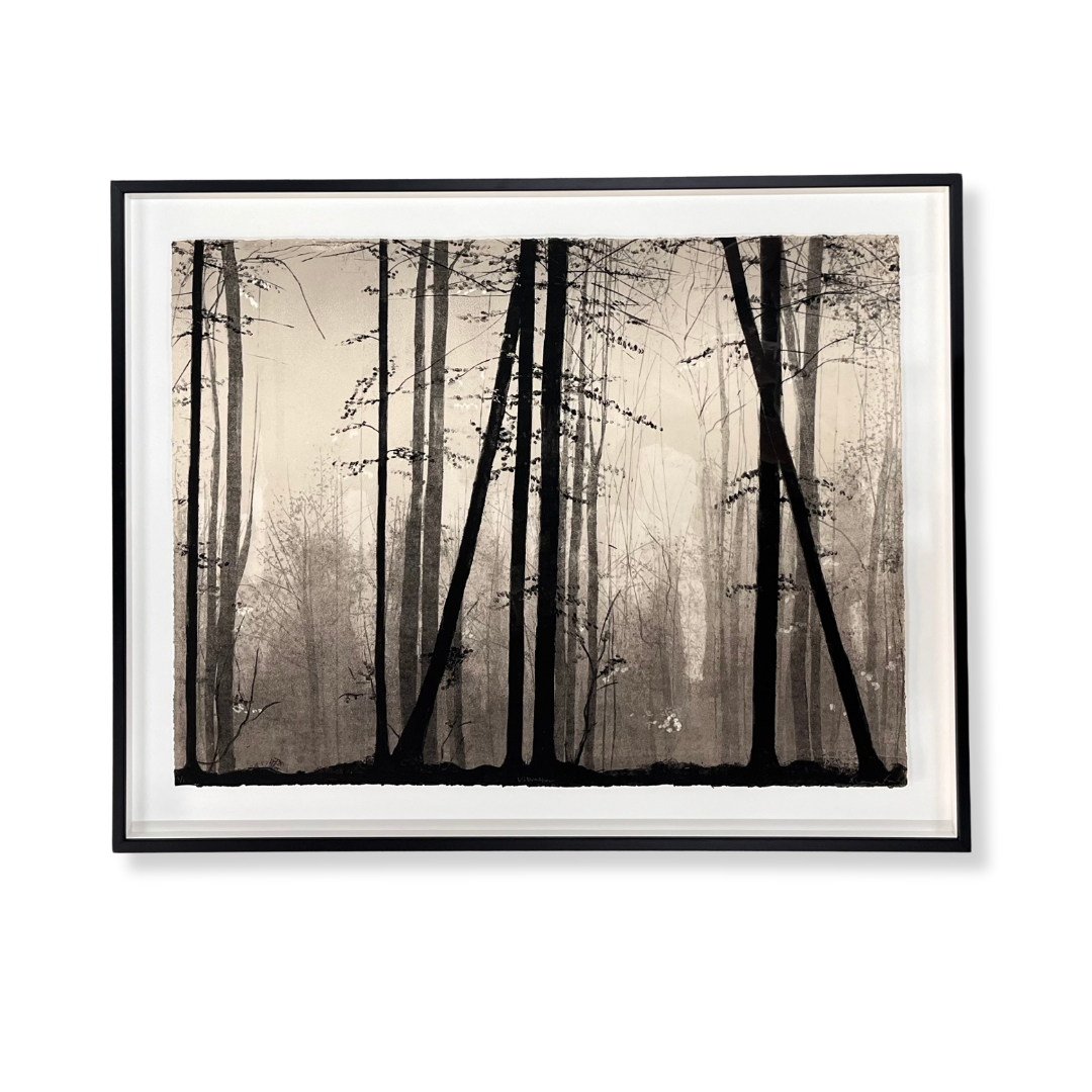 Through Fiona’s deeply atmospheric and evocative original monotypes, we step into the forest. Into the unknown, the wild and a space laden with metaphysical meaning and narrative. An important symbol for Fiona, the forest is both a mysterious, haunting place full of uncertainty and fragility, and a healing, restorative space for the planet and the individual.