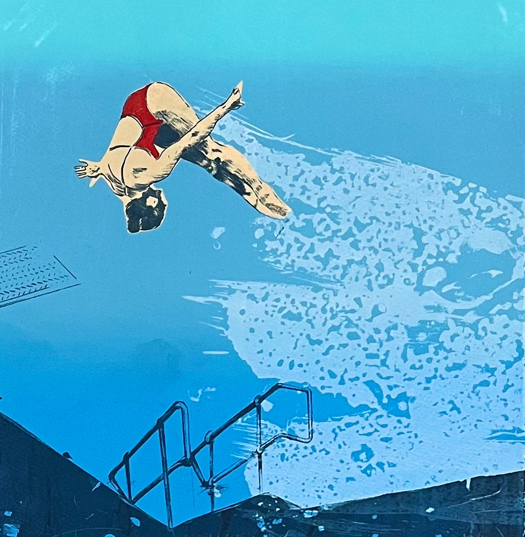 Much of Anna’s work is concerned with transition and contrast - recently taking the form of people attempting ‘flight’ - divers, swimmers, wing-walkers and more. A whimsical and illustrative artist based in Bristol, Anna transforms her fascinations and observations of the world into drawings, screen prints, collages and paintings. Architecture plays a large part - Victorian and Brutalist buildings populating her artworks much like they have done her life - Liverpool, London and Bristol. Anna is also inspired by the nostalgic and the retro - her artworks have a kitsch charm and combine storytelling with visual playfulness.